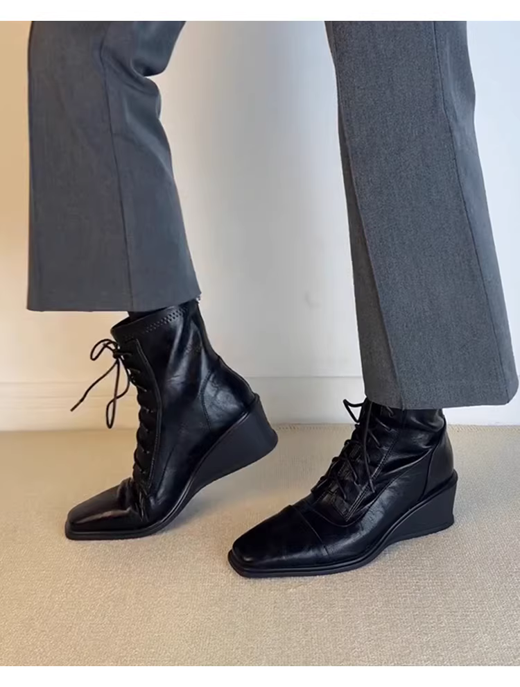 - Phiên bản da bò ~ Giày bốt mỏng tăng chiều cao gót nêm Giày bốt Martin kiểu Anh Giày bốt cổ ngắn buộc dây kiểu cổ điển đế dày mũi vuông dành cho nữ