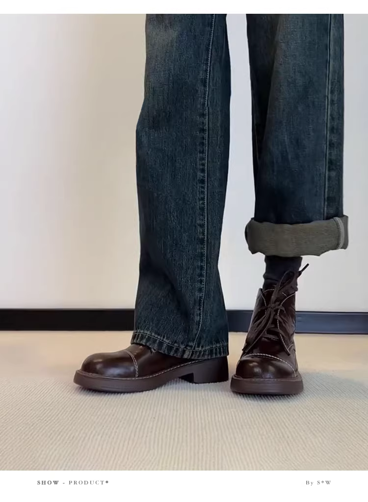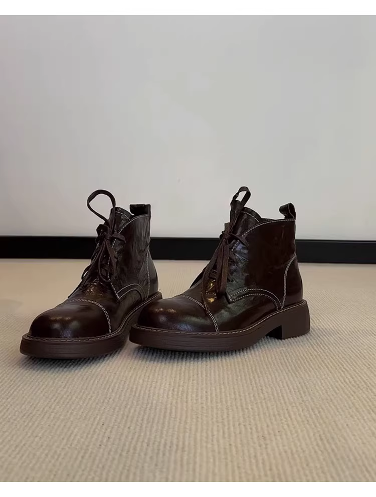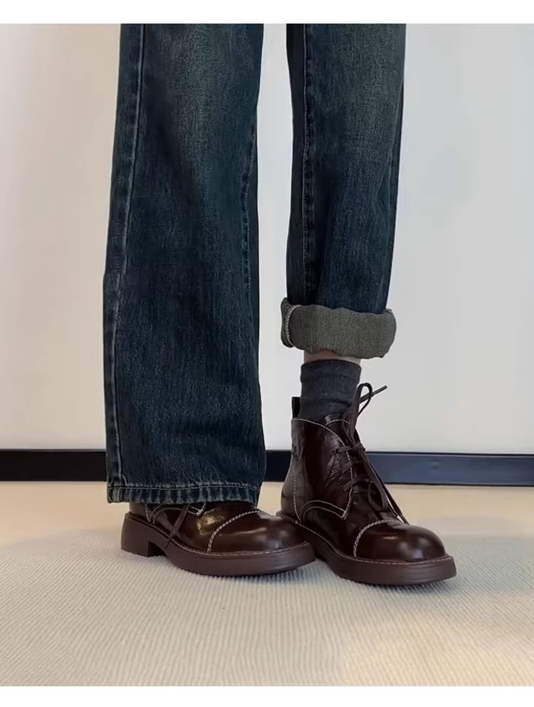- Phiên bản da bò~ Giày bốt ngắn da thật phong cách Anh quốc dành cho nữ, giày bốt Martin thời trang đi làm đa năng mũi tròn gót thấp kiểu Pháp