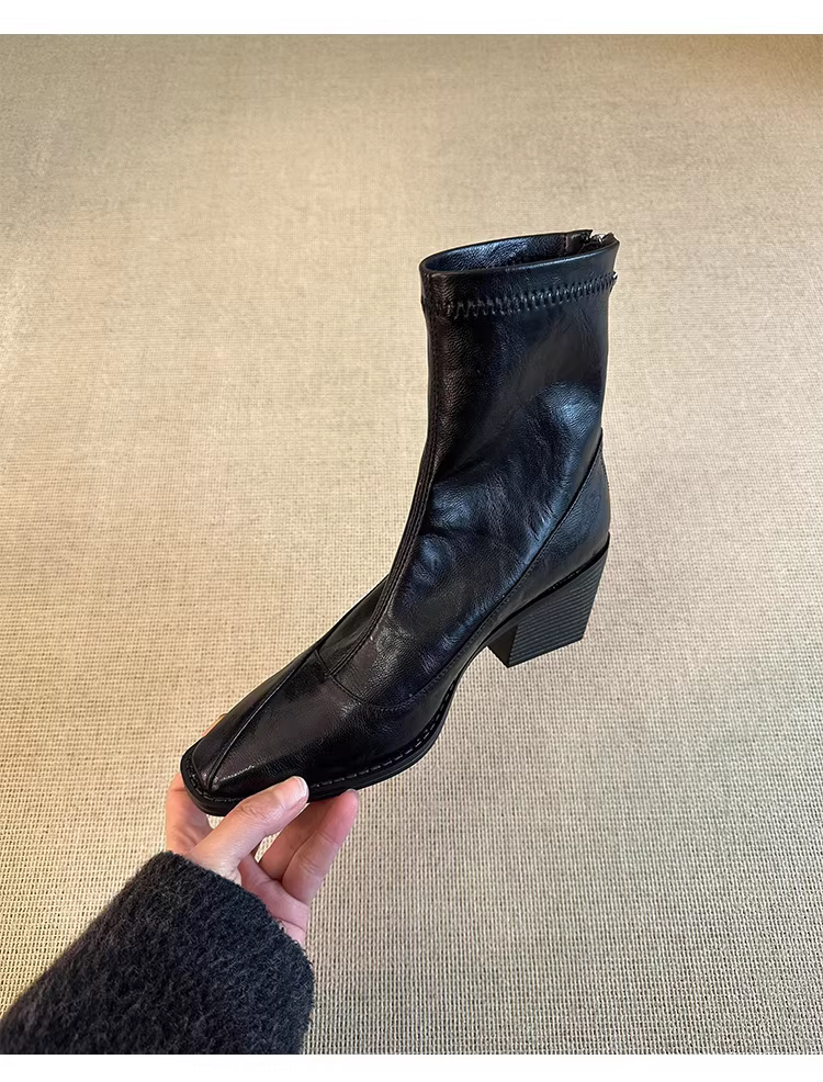 Phiên bản da bò ~ Giày bốt ngắn gót vuông mũi vuông thanh lịch và tôn dáng dành cho nữ có khóa kéo phía sau, da thật, bốt thon gọn co giãn đơn giản và thời trang.