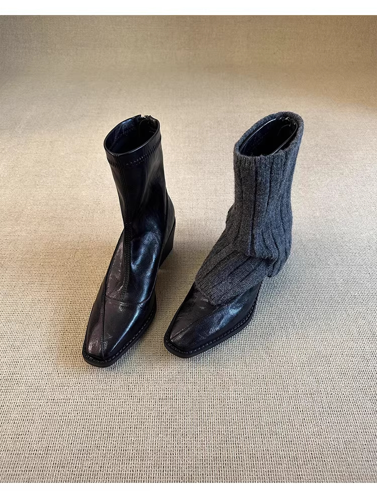 - Phiên bản da bò ~ Giày bốt ngắn gót vuông mũi vuông thanh lịch và tôn dáng dành cho nữ có khóa kéo phía sau, da thật, bốt thon gọn co giãn đơn giản và thời trang.