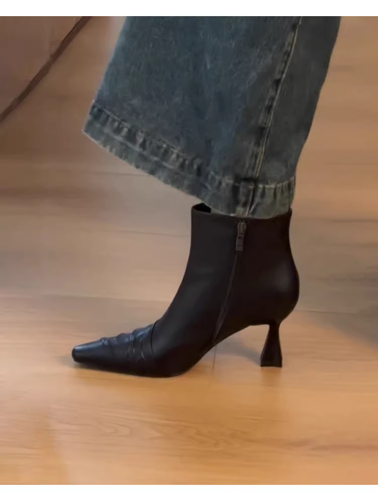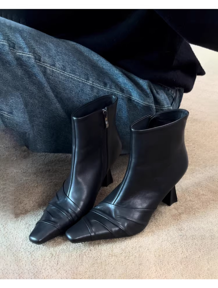 - Phiên bản da bò ~ Giày bốt ngắn mũi vuông bằng da thật có gót cao, bốt đen thon gọn đa năng theo phong cách Pháp.