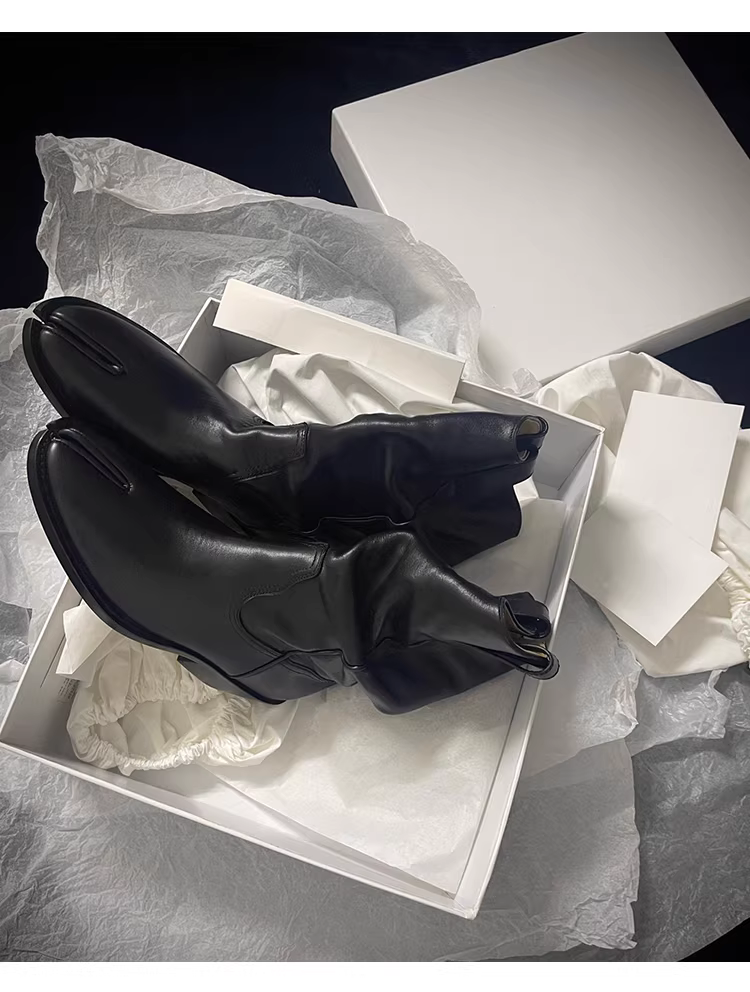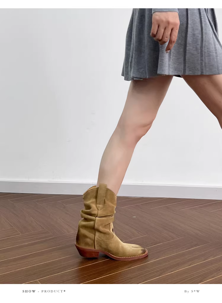 - Phiên bản da bò~ Giày cao bồi kiểu Anh cổ điển, mũi chia, da thật, gót dày xếp ly, kiểu dáng lười, ngắn, đa năng dành cho nữ