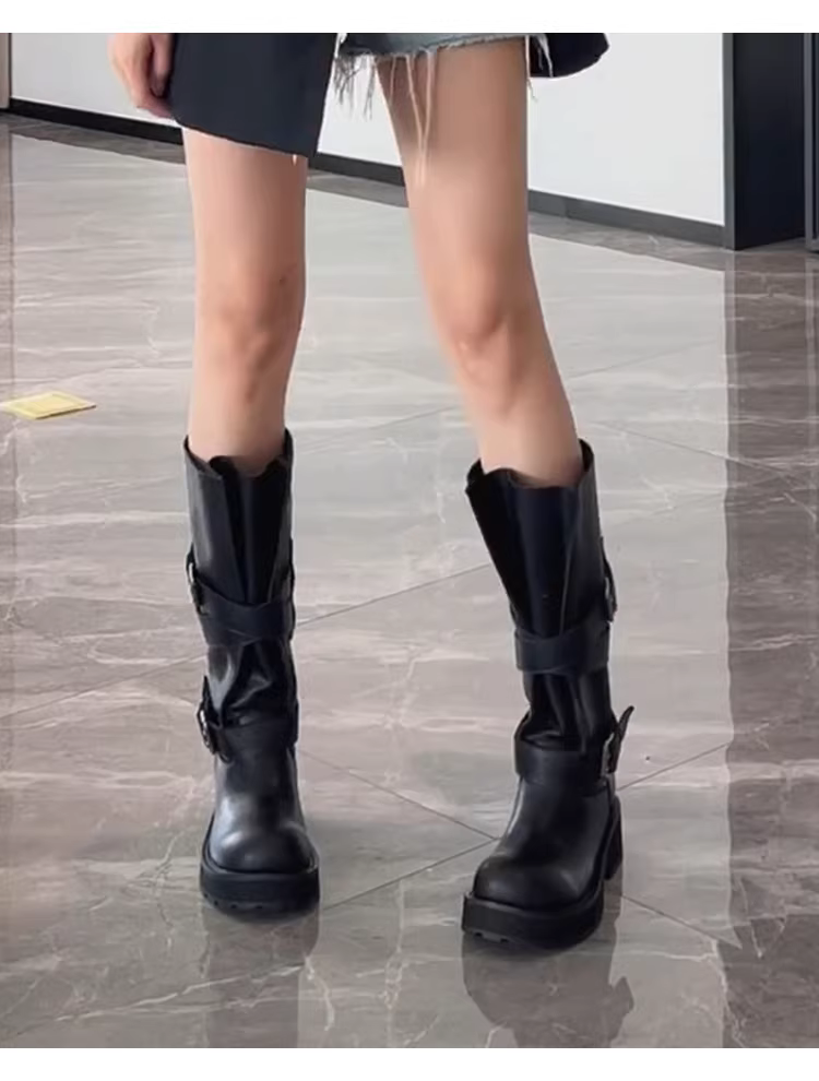 - Phiên bản da bò~ Giày cao cổ đế dày kiểu Anh giúp thon gọn dáng người dành cho nữ, kiểu retro hot girl có khóa thắt lưng, cổ cao kiểu Martin