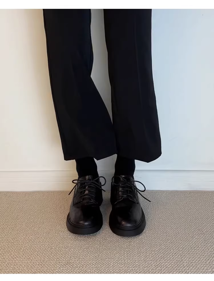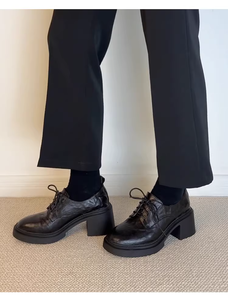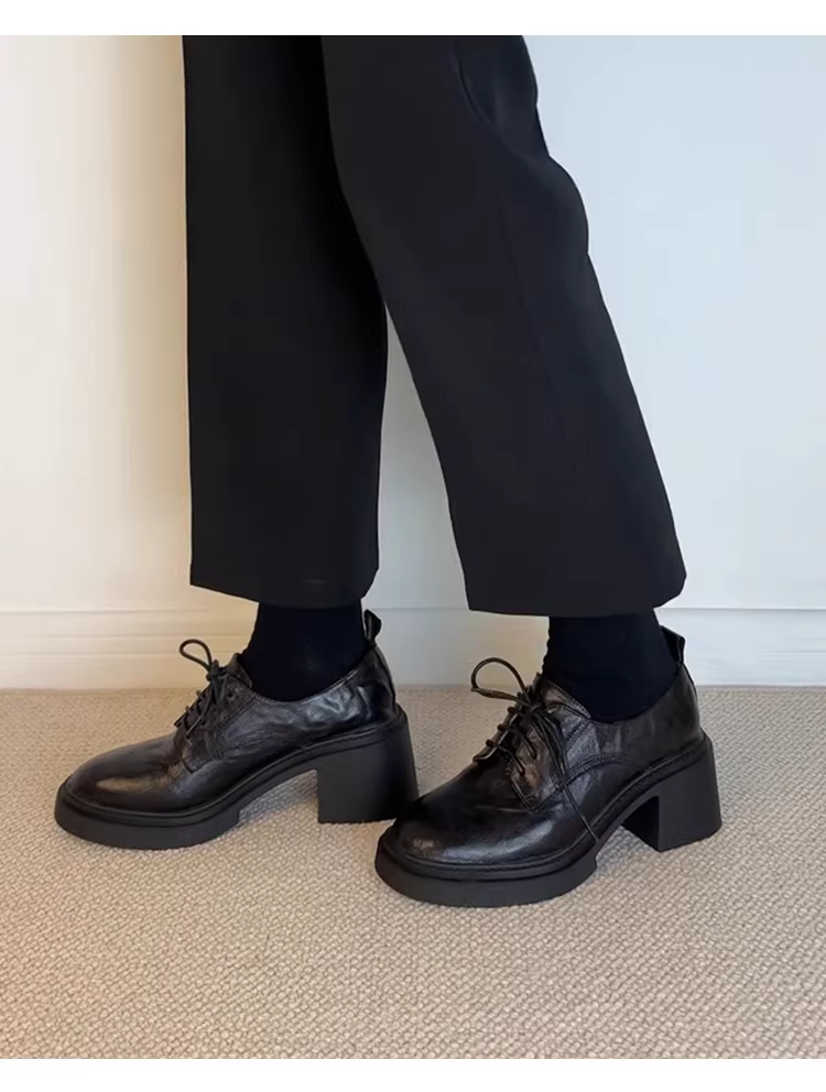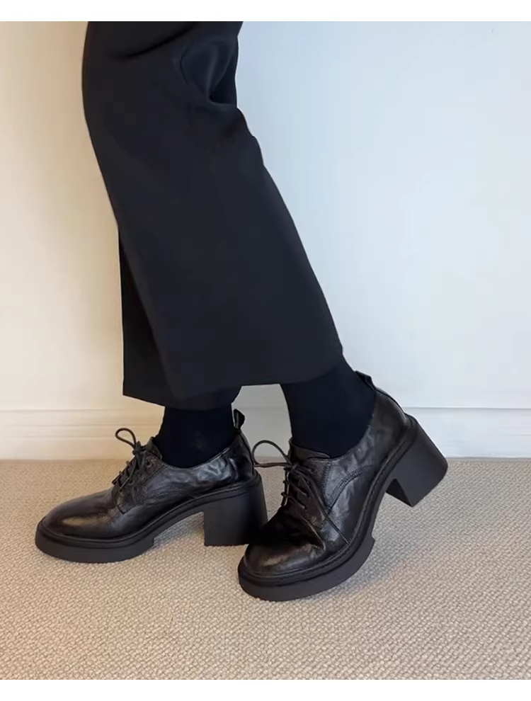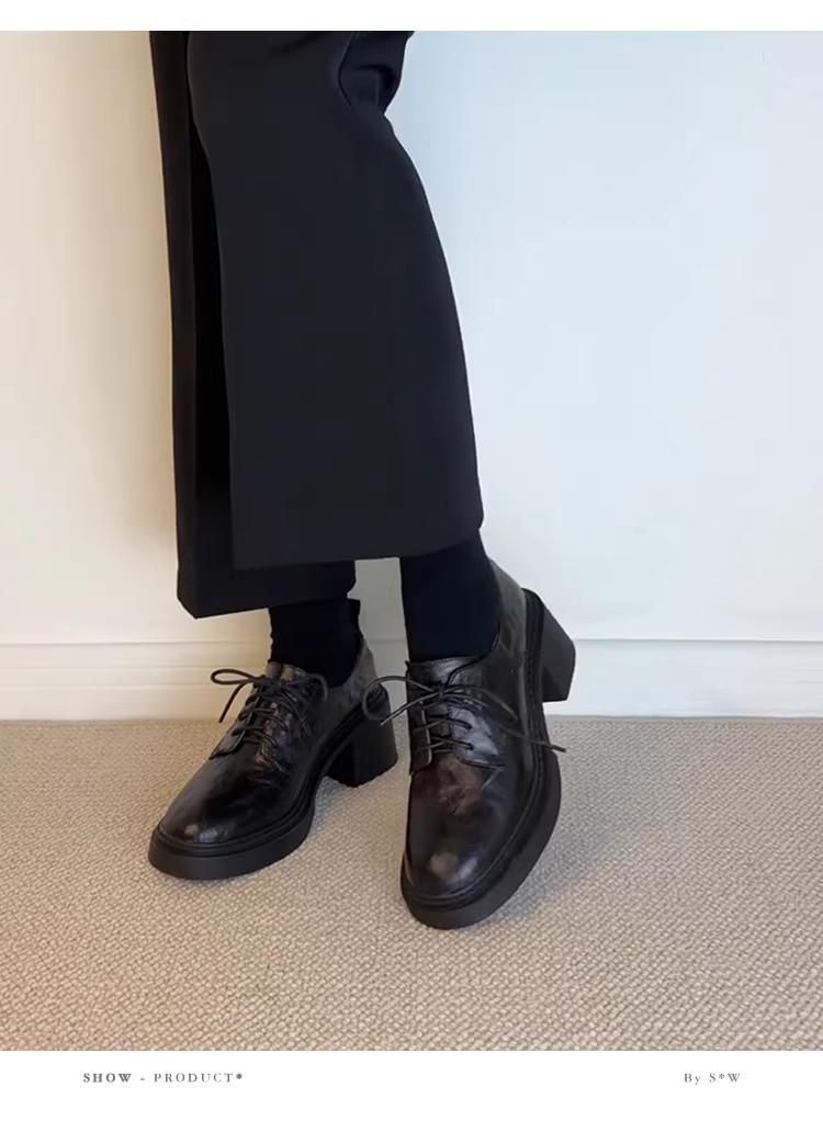 - Phiên bản da bò~ Giày lười cao gót đế dày phong cách retro kiểu Anh dành cho nữ, giày da buộc dây mũi tròn tăng chiều cao đa năng