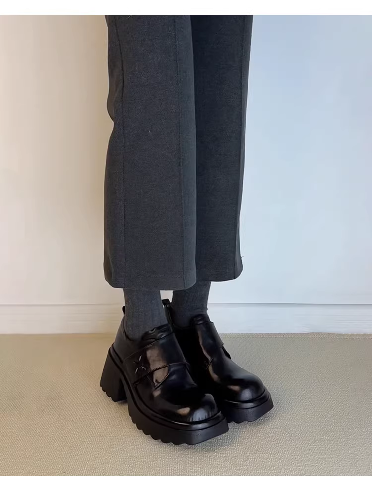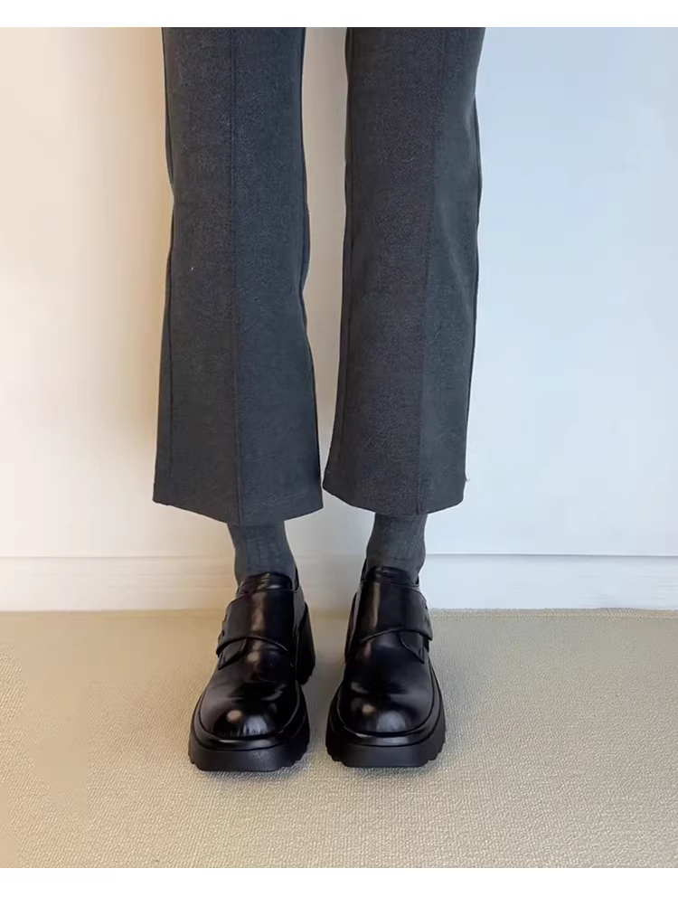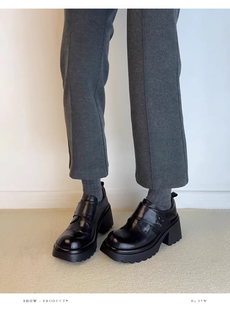 - Phiên bản da bò ~ Giày lười da thật đế dày tăng chiều cao có khóa dán, giày da nhỏ kiểu Anh bằng da thật có gót dày.