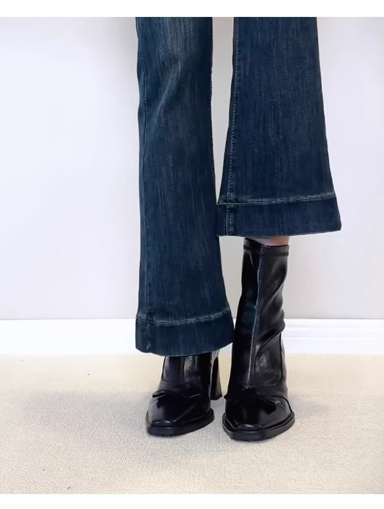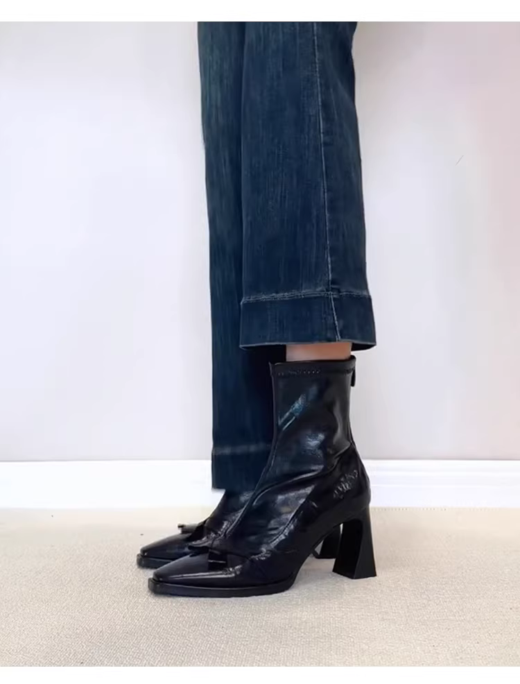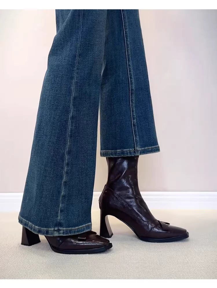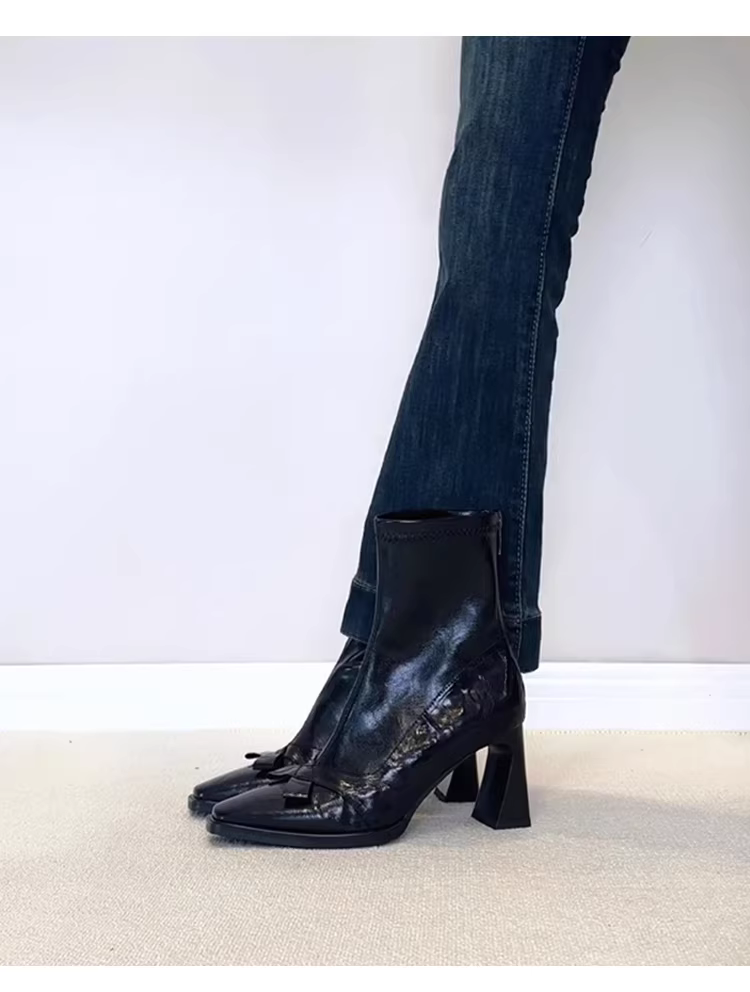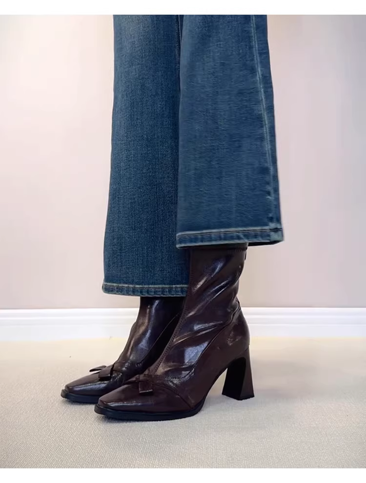 - Phiên bản da bò~Giày bốt cổ ngắn mũi vuông kiểu Anh dành cho nữ có khóa kéo phía sau, bốt ôm dáng co giãn, bốt Martin cao gót thắt nơ