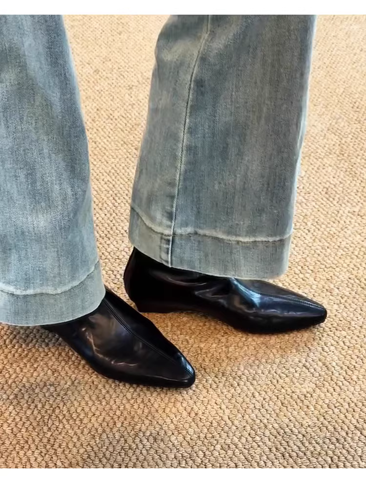- Phiên bản da bò~Giày bốt ngắn đế xuồng mũi nhọn kiểu Hàn Quốc có dây kéo phía sau, giày bốt thời trang cổ điển thời trang dành cho nữ