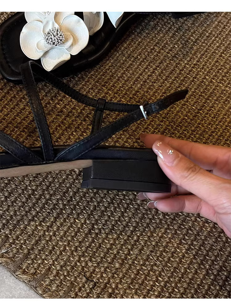 - Phiên bản da cừu ~ Dép đế bằng họa tiết hoa màu đen dành cho nữ, phong cách đi nghỉ, mũi vuông, hở mũi, dép thời trang da thật đa năng