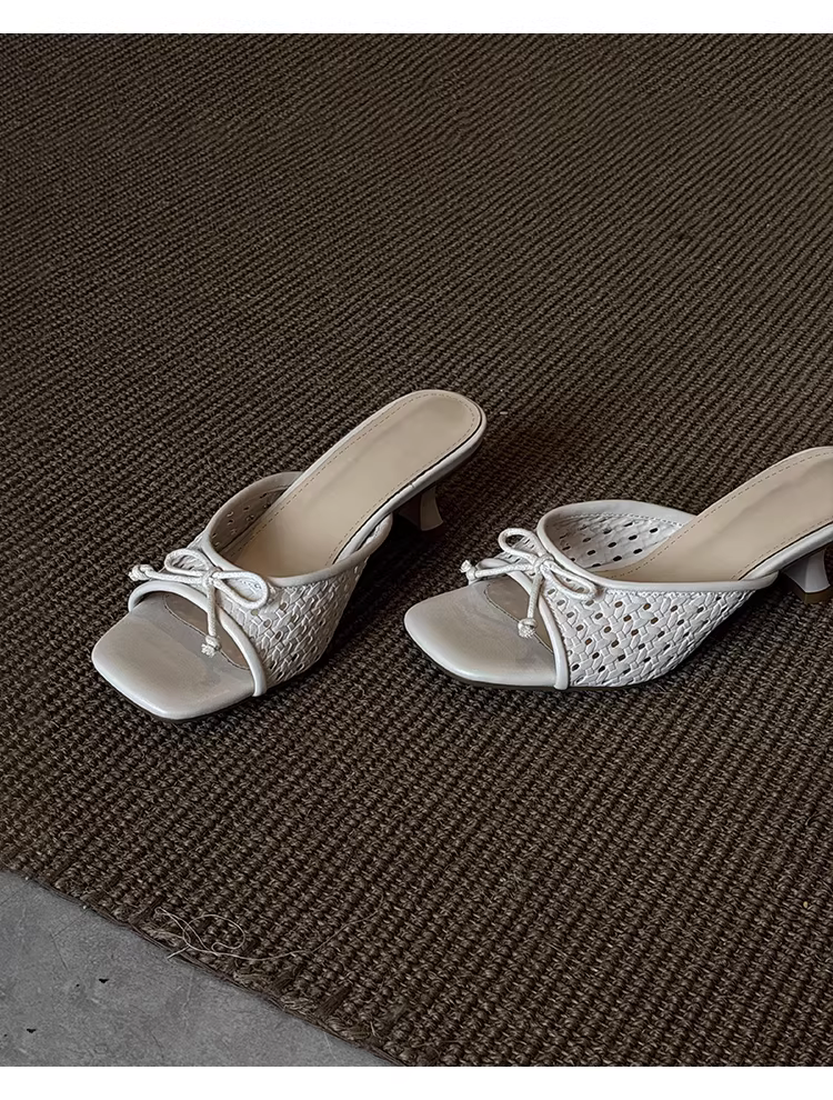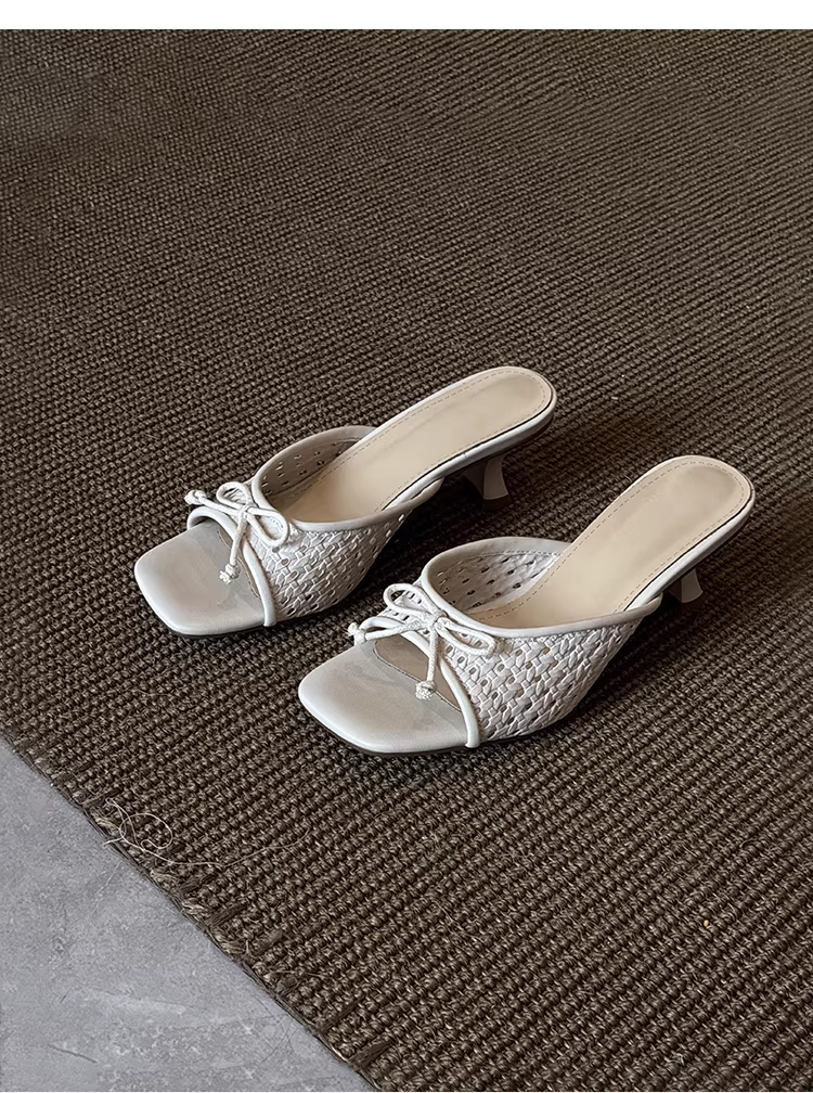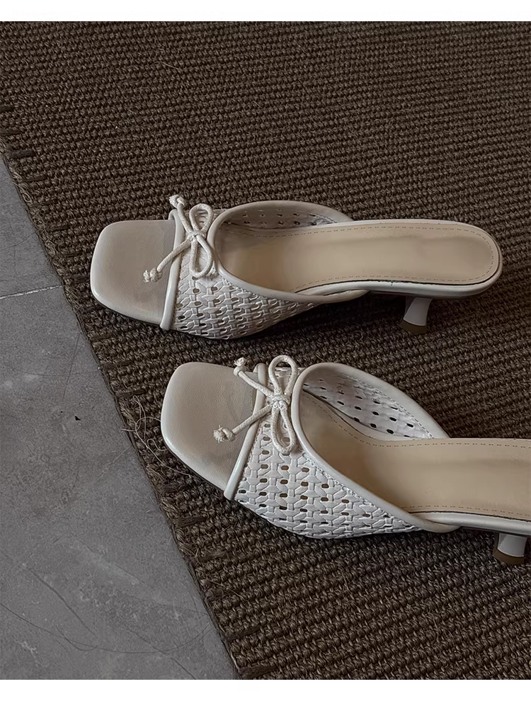 - Phiên bản da cừu ~ Dép dệt kiểu nghỉ dưỡng dành cho nữ, dép quai ngang đa năng có nơ, mũi vuông, gót cao dành cho mùa hè