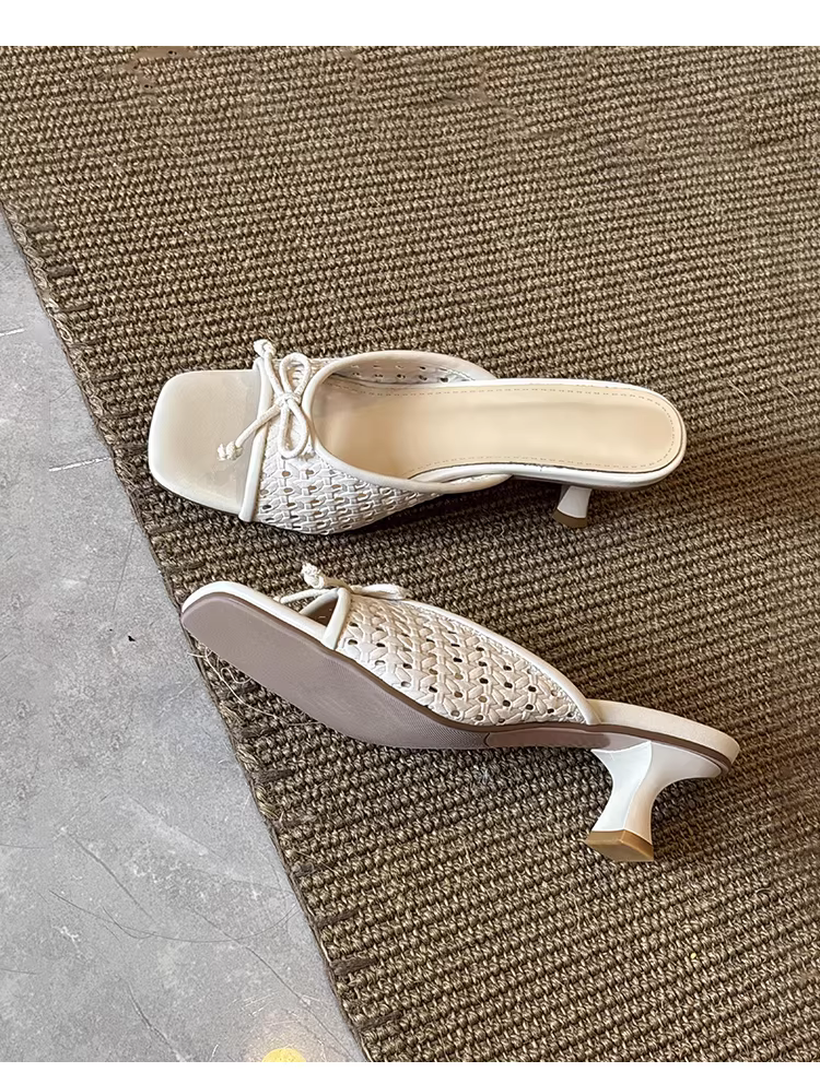 Phiên bản da cừu ~ Dép dệt kiểu nghỉ dưỡng dành cho nữ, dép quai ngang đa năng có nơ, mũi vuông, gót cao dành cho mùa hè