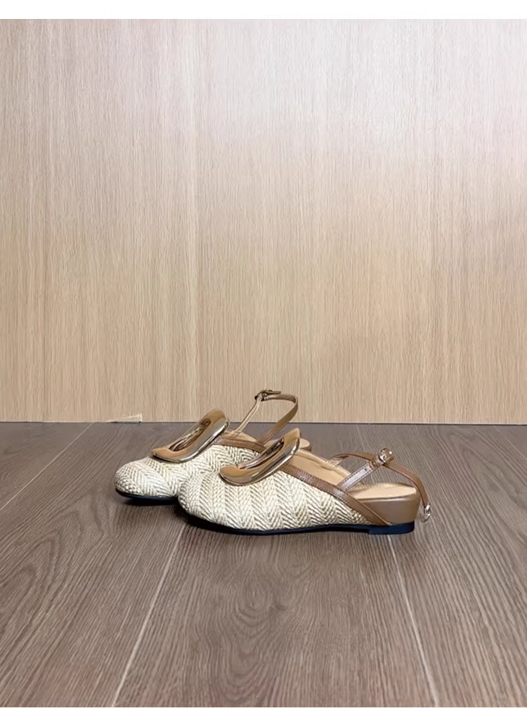 Phiên bản da cừu ~ Dép kiểu nghỉ dưỡng dệt bằng rơm độc đáo và sành điệu dành cho nữ với dây đeo phía sau, thiết kế rỗng, gót wedge và kiểu dáng dễ mang.