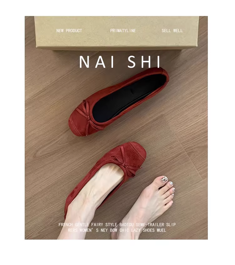 Phiên bản da cừu! Giày bệt màu đỏ dành cho nữ có nơ, phong cách dạ hội cổ điển, giày bệt, mũi vuông, giày bà ngoại miệng nông.
