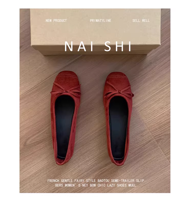 - Phiên bản da cừu! Giày bệt màu đỏ dành cho nữ có nơ, phong cách dạ hội cổ điển, giày bệt, mũi vuông, giày bà ngoại miệng nông.