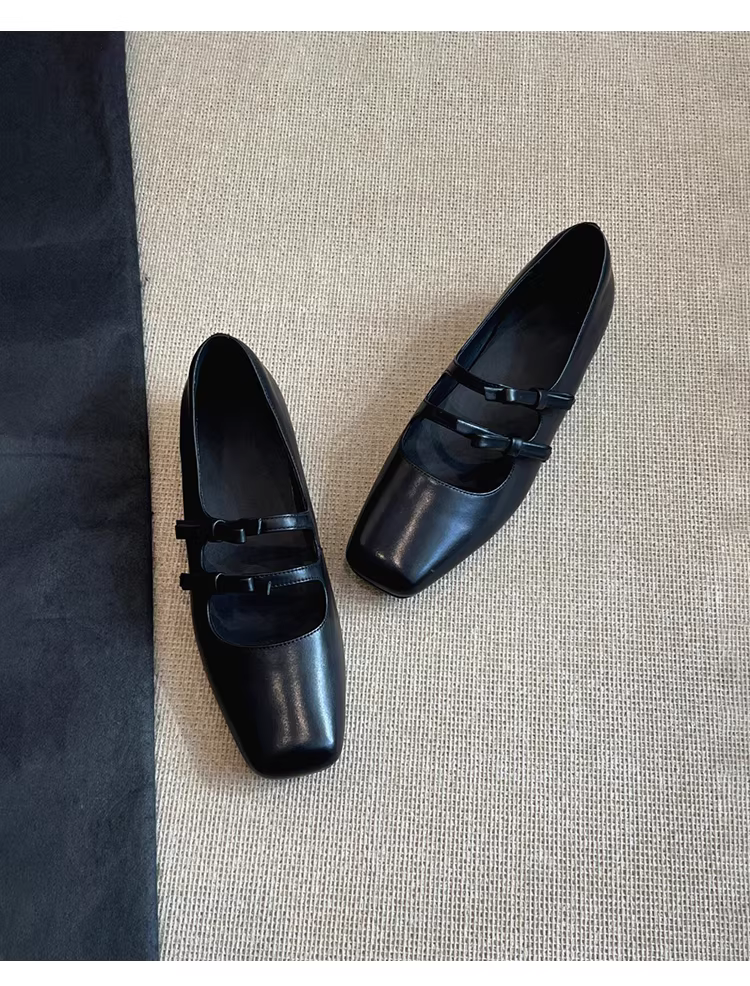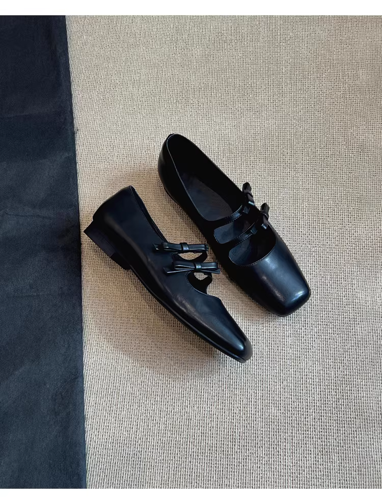 - Phiên bản da cừu ~ Giày bệt mũi vuông kiểu cổ điển có nơ dành cho nữ, giày Mary Jane đa năng bằng da thật nông