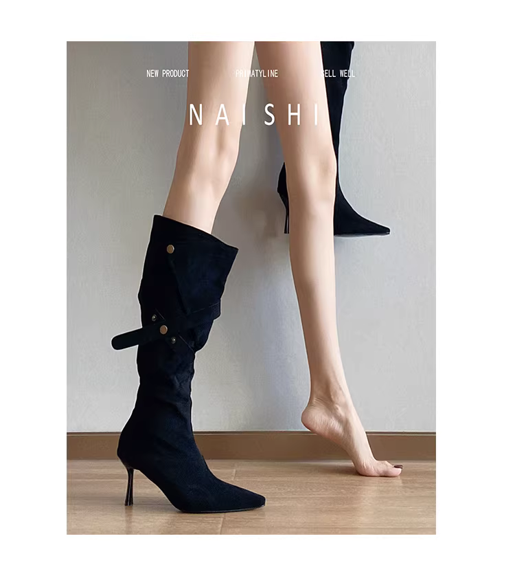- Phiên bản da cừu! Giày bốt cao cổ màu đen cổ điển dành cho nữ, kiểu dáng hoang dã mũi nhọn, chu vi bắp chân rộng, giày cao gót kiểu stiletto.