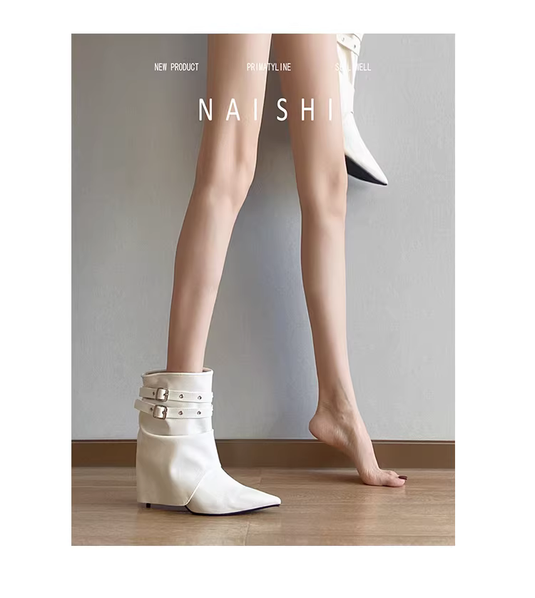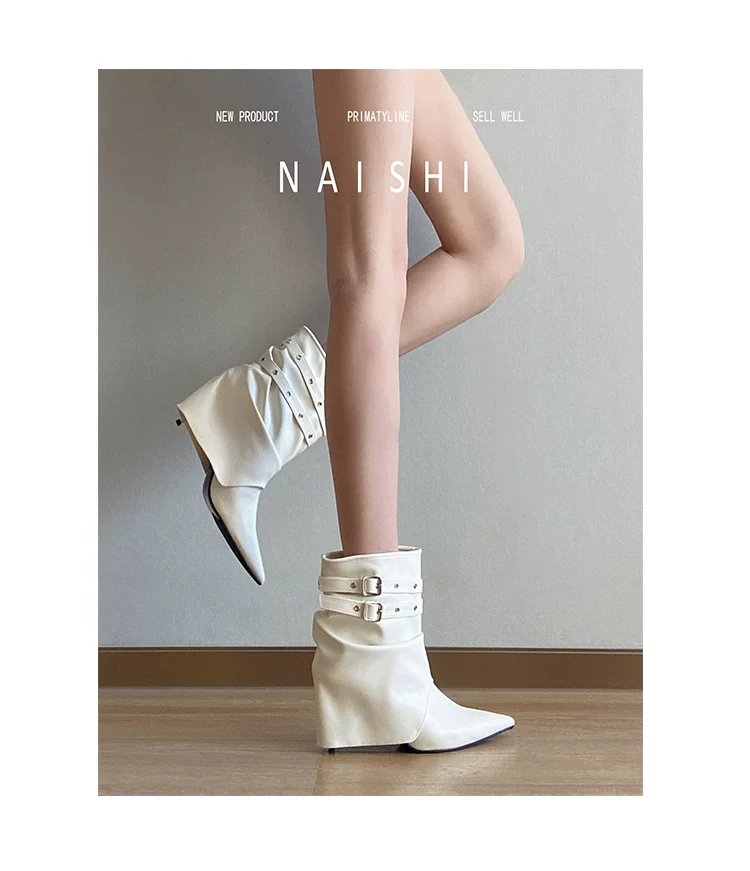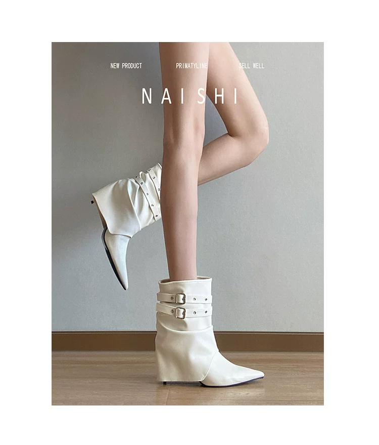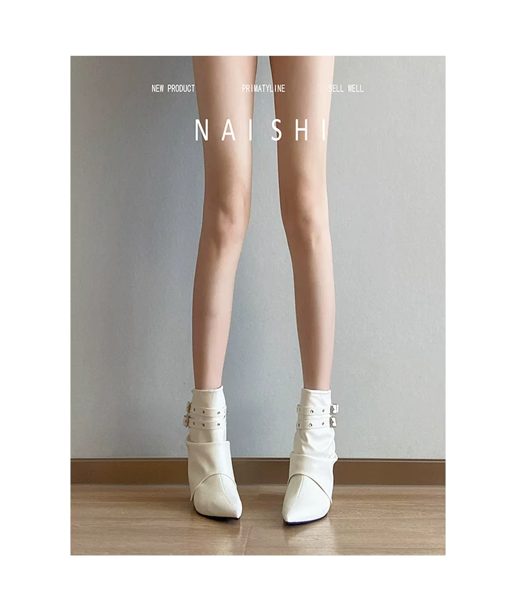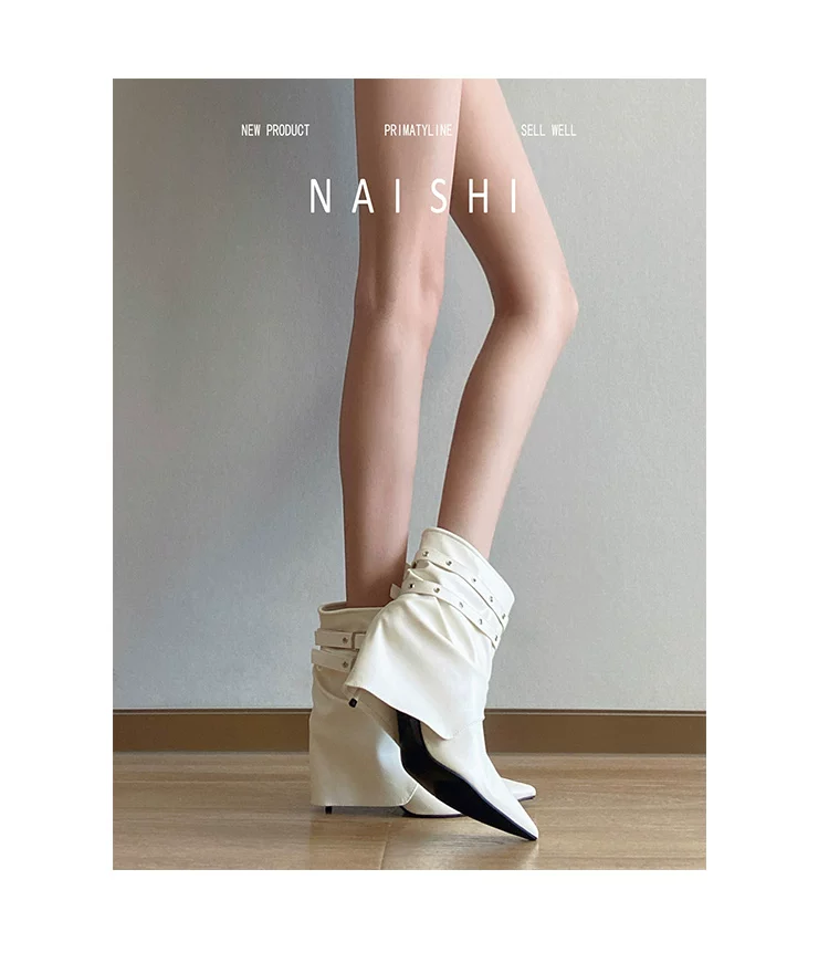 - Phiên bản da cừu! Giày bốt cao gót mũi nhọn thời trang mang phong cách Pháp cao cấp, bốt trắng phối dây lưng, bốt cao gót dáng thon.