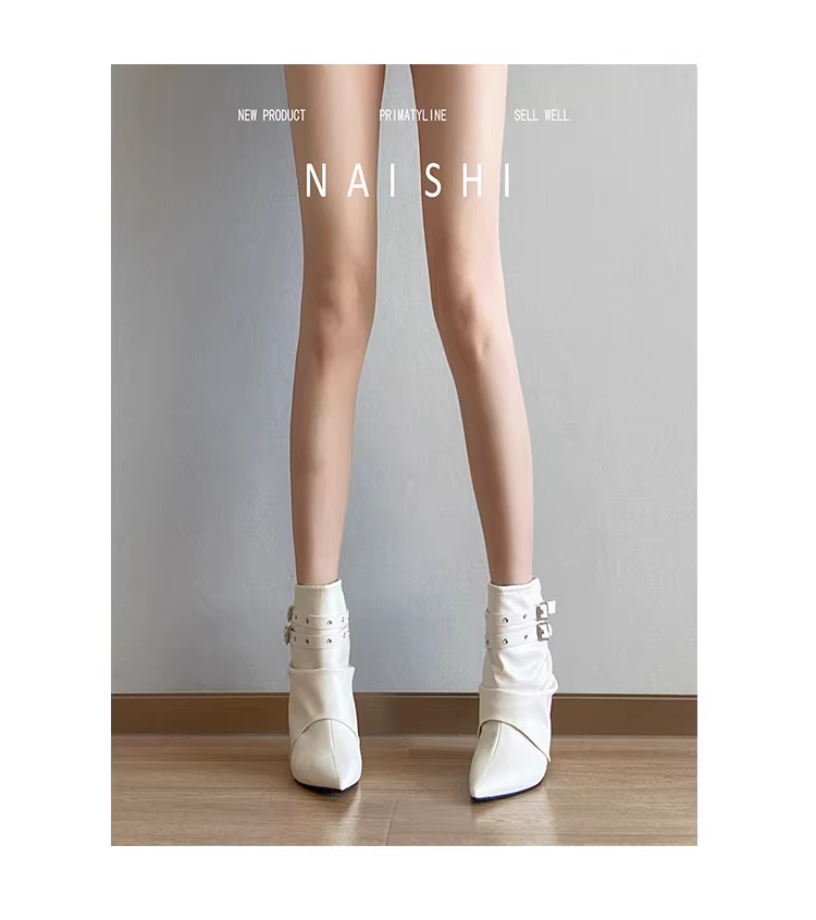 Phiên bản da cừu! Giày bốt cao gót mũi nhọn thời trang mang phong cách Pháp cao cấp, bốt trắng phối dây lưng, bốt cao gót dáng thon.