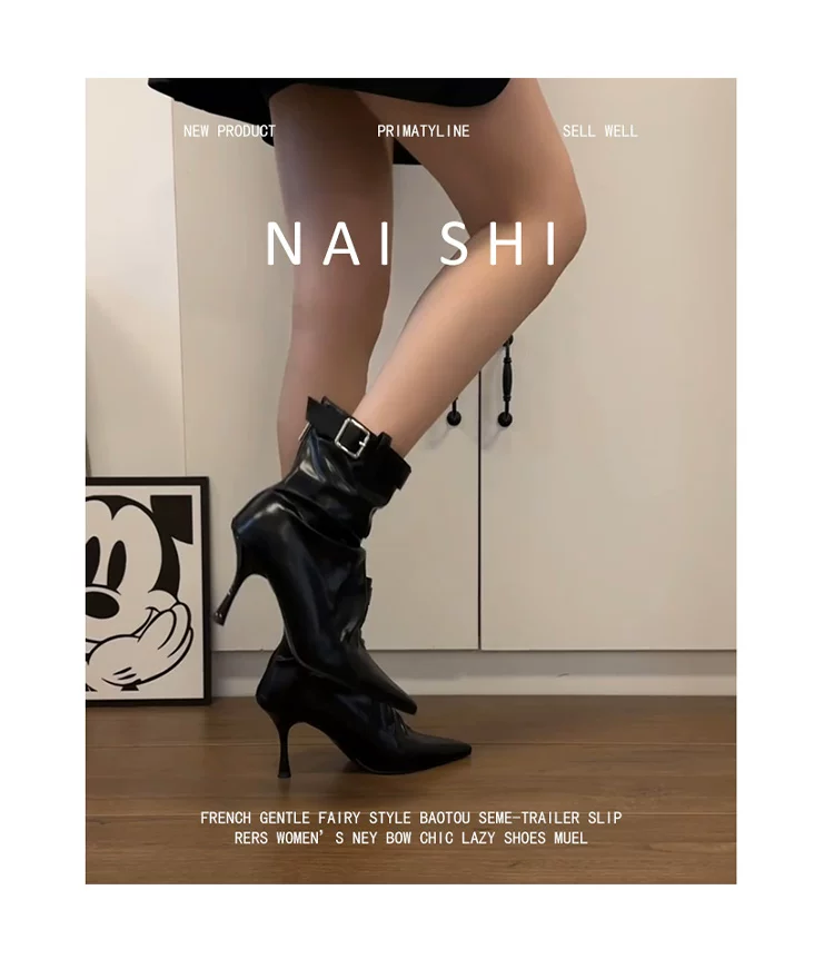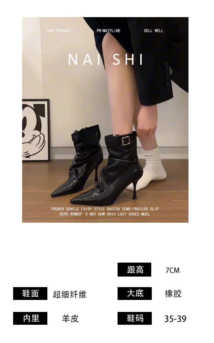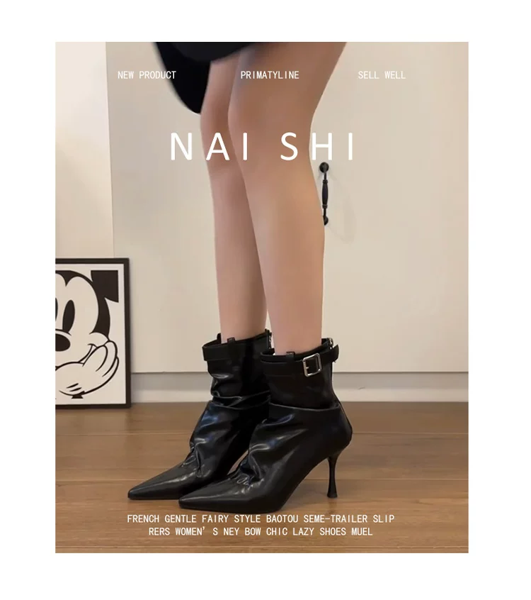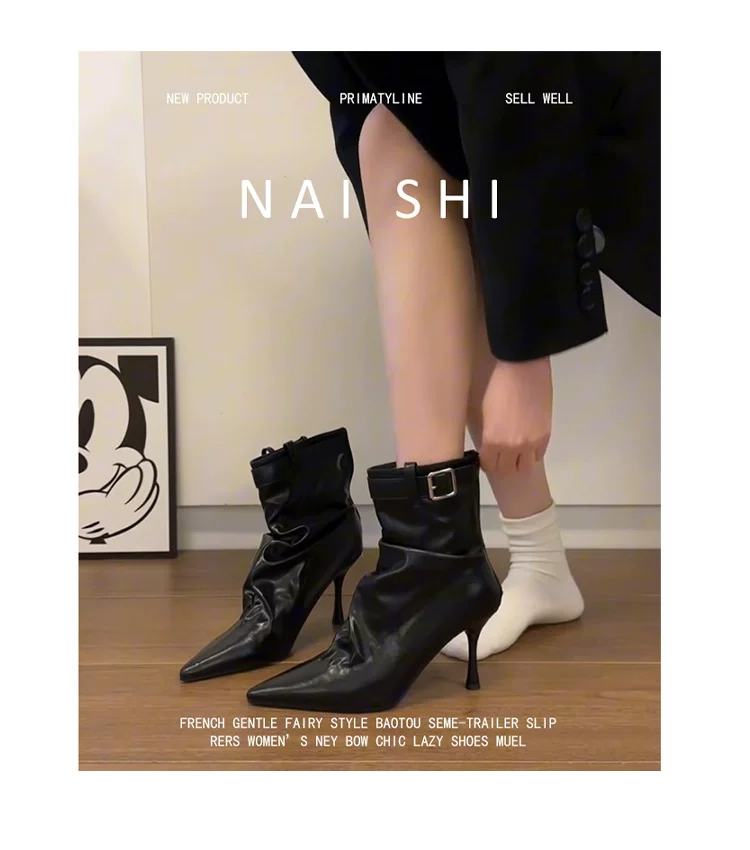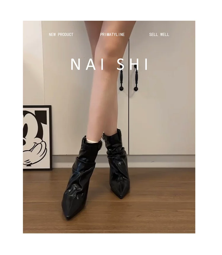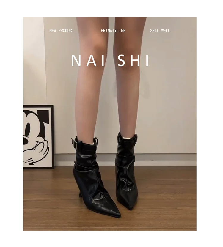 - Phiên bản da cừu! Giày bốt cao gót ngắn có khóa thắt lưng thời trang dành cho nữ, mũi nhọn, bốt xếp ly, da thật, gót nhọn thanh lịch, bốt co giãn.