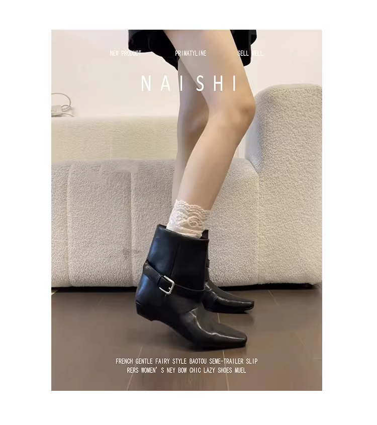 - Phiên bản da cừu! Giày bốt cổ ngắn màu đen có khóa thắt lưng cổ điển Giày bốt Chelsea mũi vuông Giày bốt đế xuồng Giày bốt quần dài tăng chiều cao Giày bốt Martin
