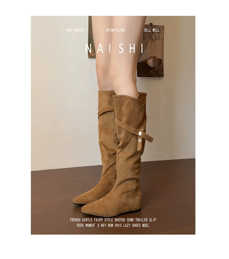 Phiên bản da cừu! Giày cao bồi kiểu Maillard với thiết kế thời trang, giày cao cổ tăng chiều cao, giày da lộn cổ điển dành cho nữ.