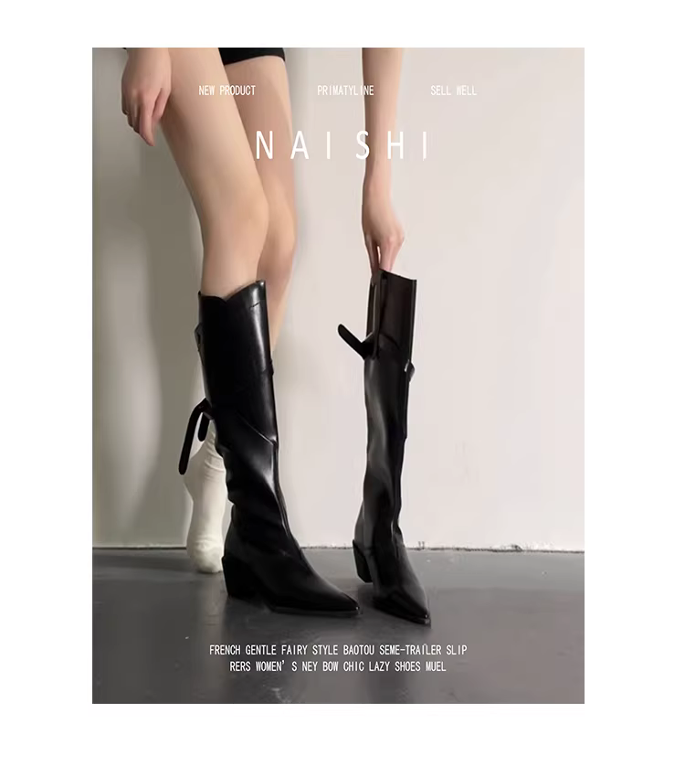 - Phiên bản da cừu! Giày cao cổ kiểu hiệp sĩ mũi nhọn có khóa thắt lưng, mang lại cảm giác sang trọng, giày cao gót đế thô kiểu biker, giày cao bồi kiểu miền Tây dài trên đầu gối.
