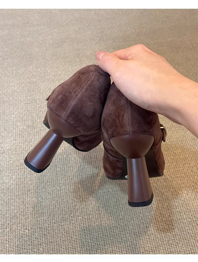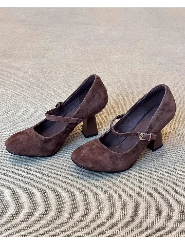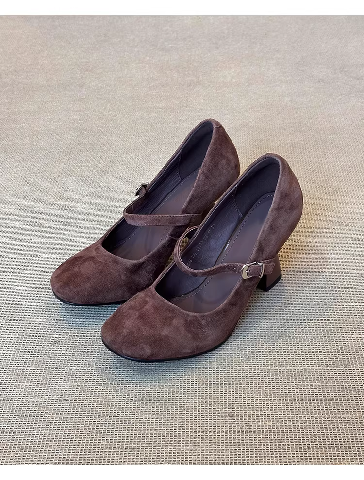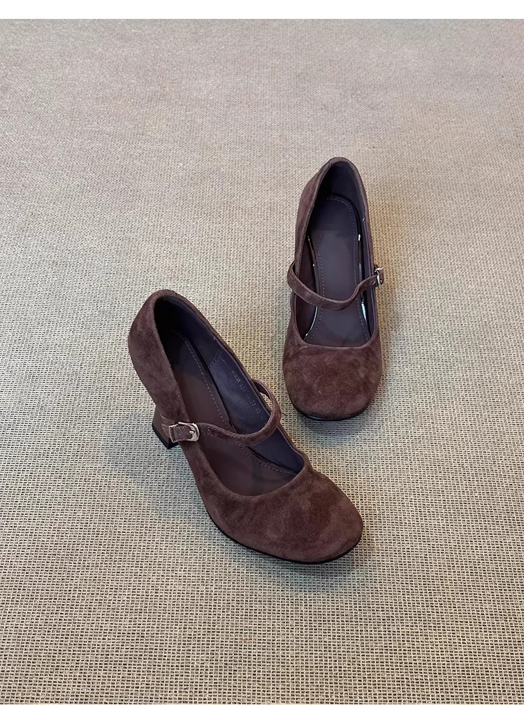 - Phiên bản da cừu ~ Giày cao gót mũi tròn mới dành cho nữ, giày Mary Jane đơn giản có quai đơn, giày đế bằng da lộn cổ điển dành cho nữ