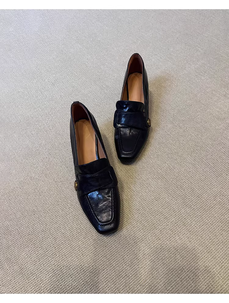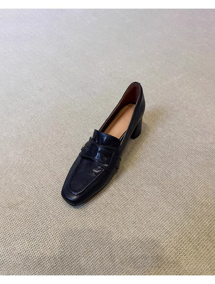 Phiên bản da cừu ~ Giày da đi làm đa năng phong cách Pháp dành cho nữ, mũi vuông, gót dày, giày cao gót nông, giày lười thanh lịch.