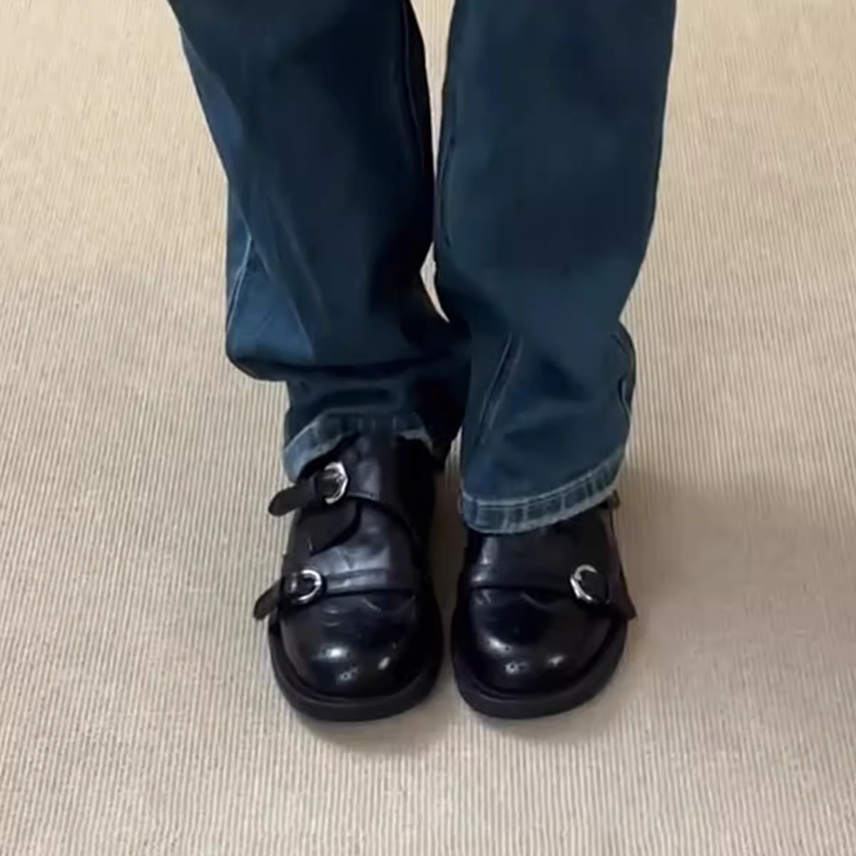 - Phiên bản da cừu ~ Giày da kiểu Anh dành cho nữ, giày da thật cao gót kiểu chunky thiết kế thời trang có khóa thắt lưng, giày lười mũi tròn