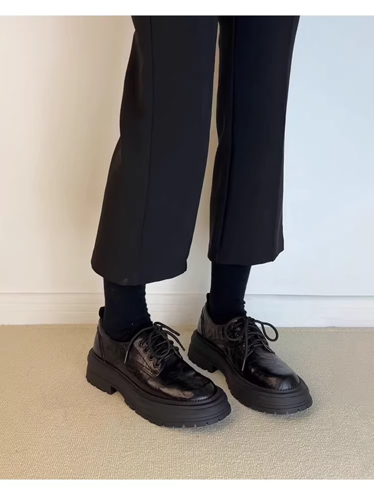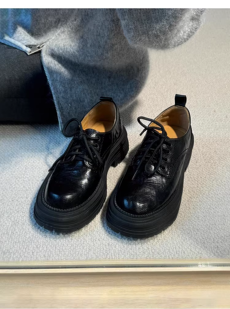 Phiên bản da cừu ~ Giày da thật đế dày kiểu Anh có dây buộc dành cho nữ, giày đế tròn mũi tròn kiểu cổ điển đa năng phong cách đại học
