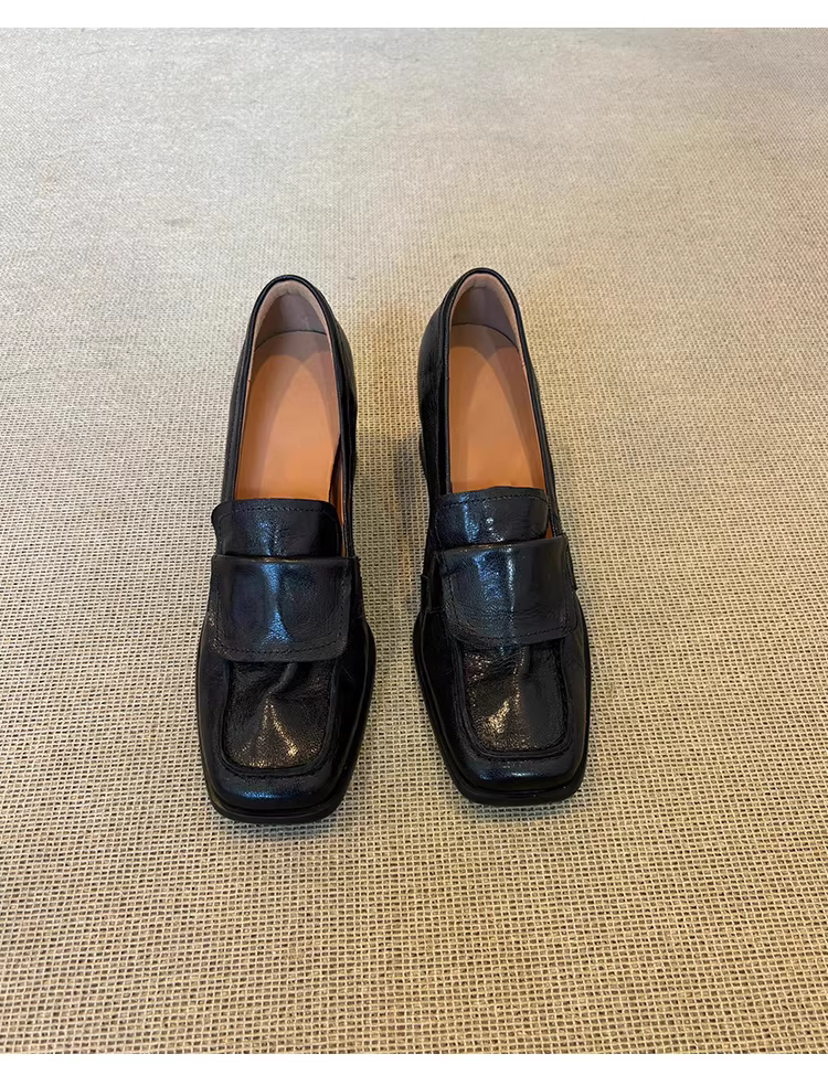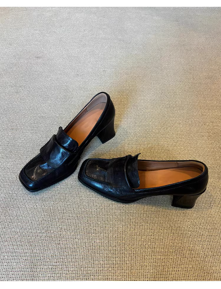 Phiên bản da cừu ~ Giày da thật mũi vuông kiểu cổ điển nghệ thuật dành cho nữ, giày cao gót đi làm, giày lười đế dày