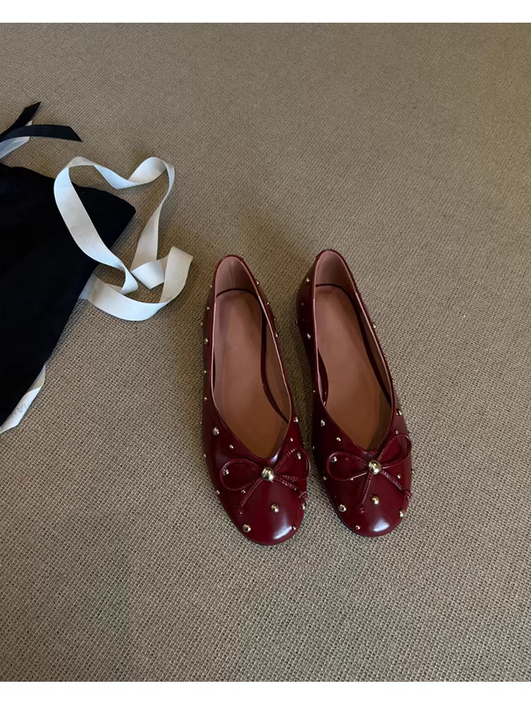 Phiên bản da cừu ~ Giày đế bằng nông thời trang có đinh tán dành cho nữ, giày đơn có nơ kiểu Pháp, giày dạ hội đa năng kiểu slip-on.