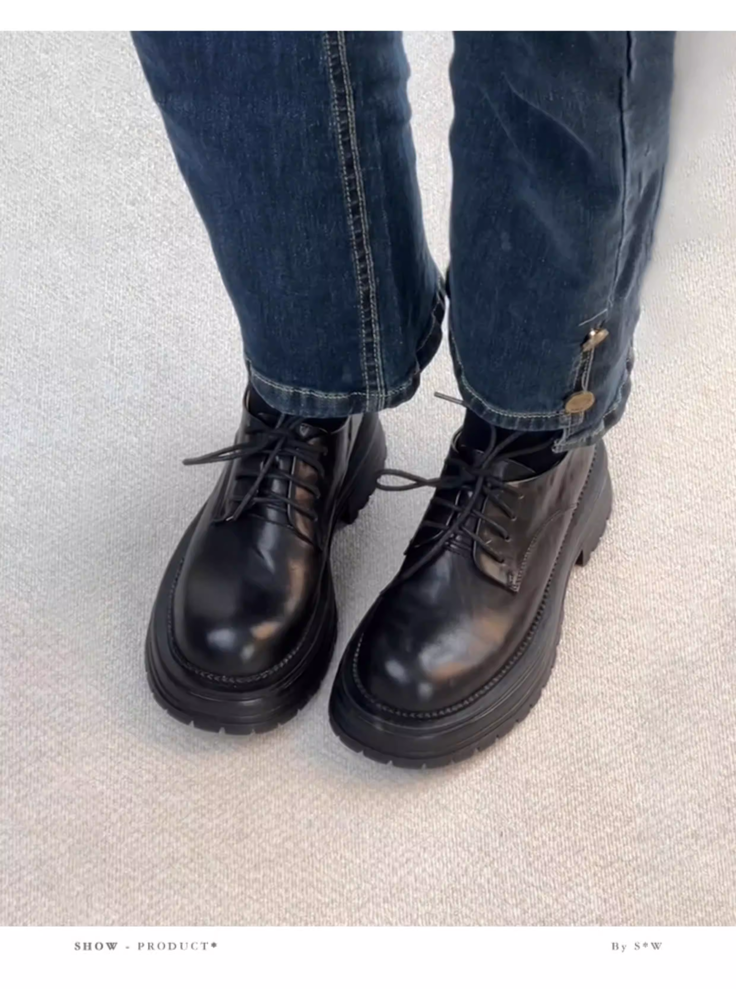 - Phiên bản da cừu ~ Giày đế dày phong cách đại học đa năng dành cho nữ, giày lười da thật đế dày buộc dây, giày da nhỏ mũi tròn kiểu cổ điển.