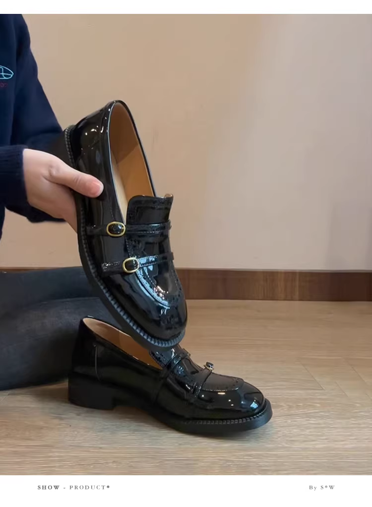 Phiên bản da cừu ~ Giày đế thấp có khóa da chạm khắc dành cho nữ, giày da nhỏ mũi tròn phong cách Anh, giày lười da thật