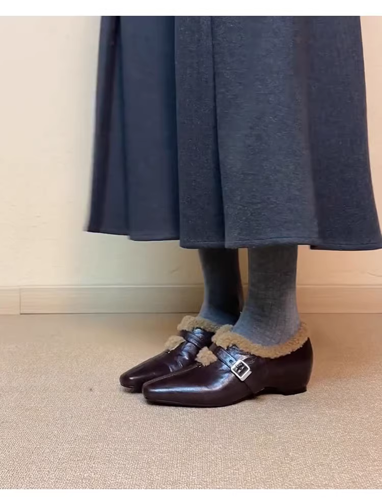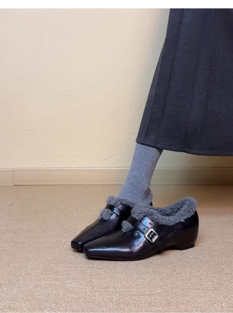- Phiên bản da cừu ~ Giày đơn mũi nhọn kiểu Pháp thanh lịch tăng chiều cao dành cho nữ, giày lông xù kiểu lười, giày đế bằng lót lông cừu ấm áp.