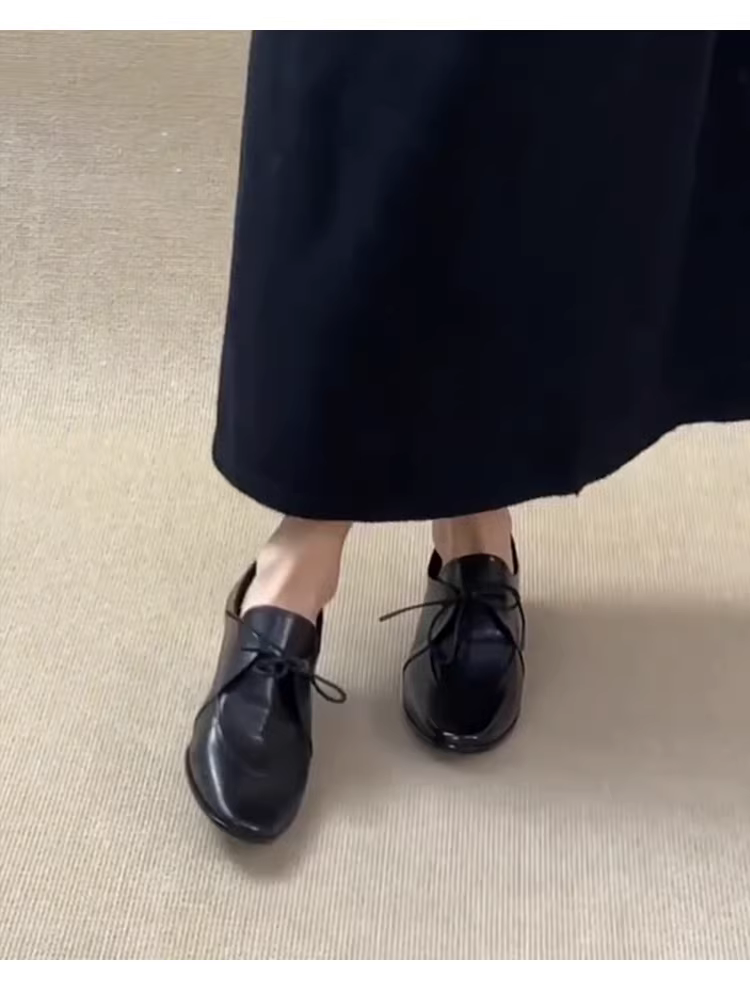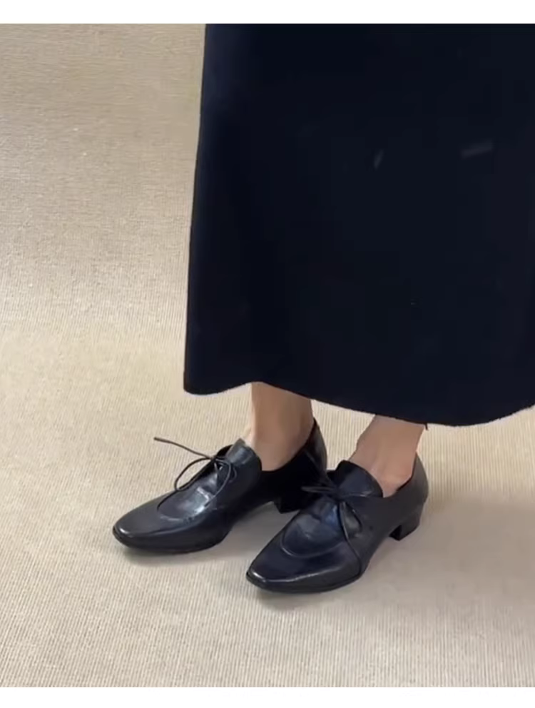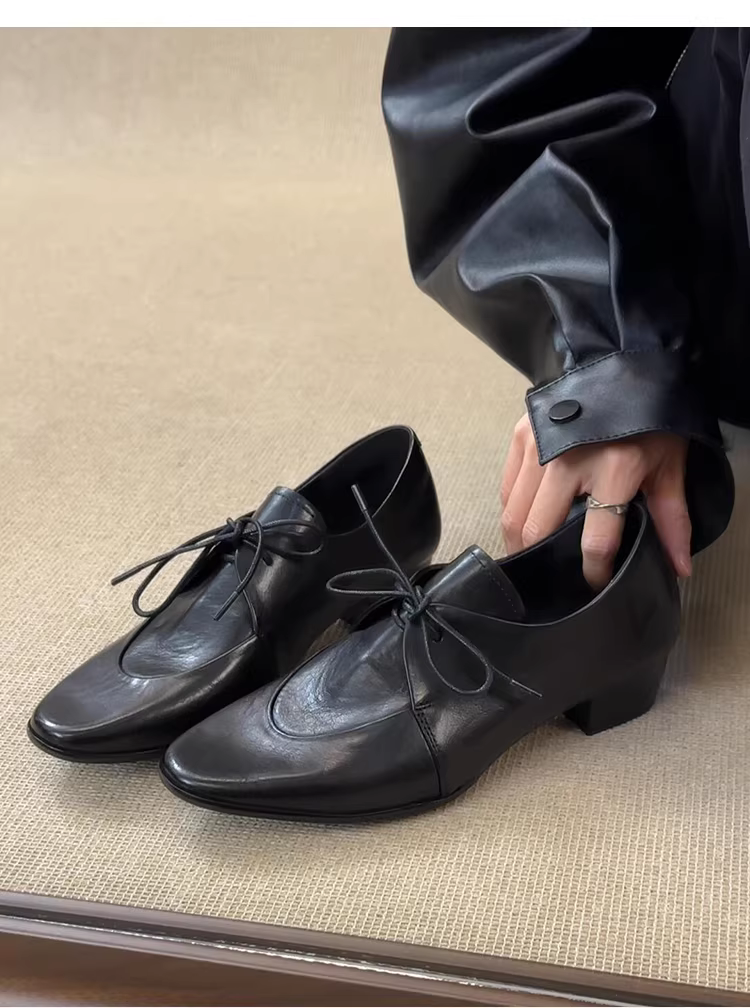 - Phiên bản da cừu ~ Giày đơn nhỏ màu đen có dây buộc mới dành cho nữ, giày lười da thật đế dày cổ điển, giày da nhỏ cổ điển.