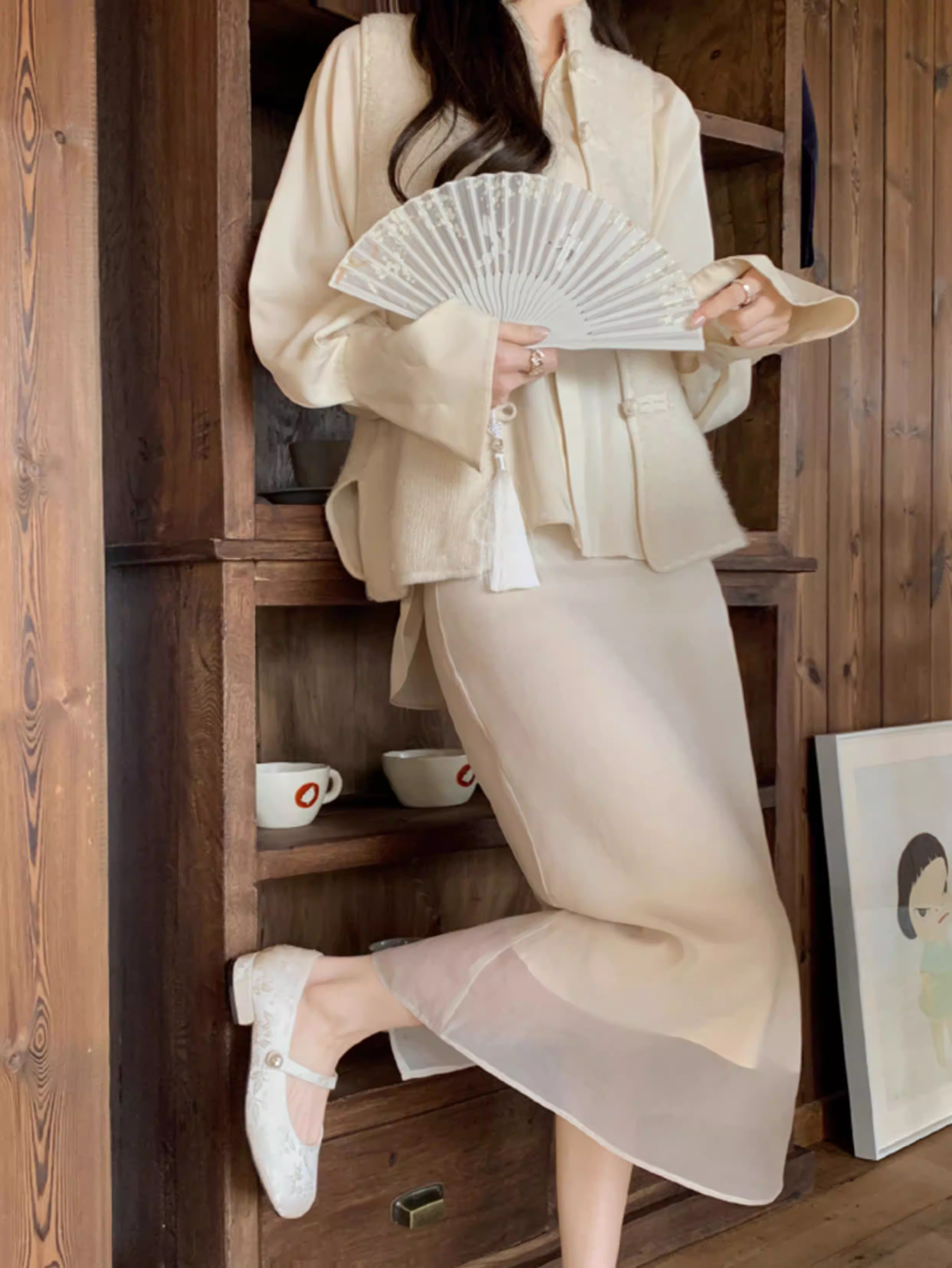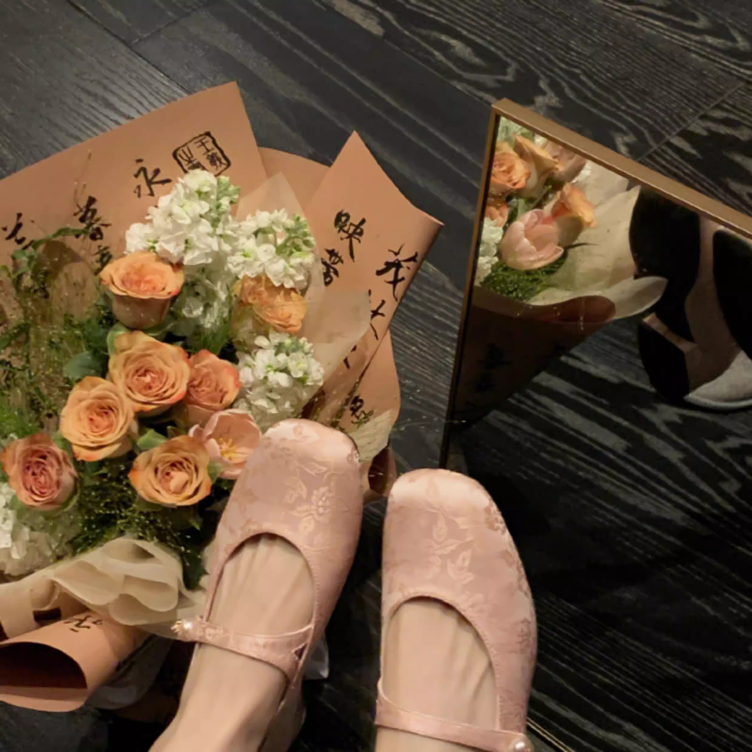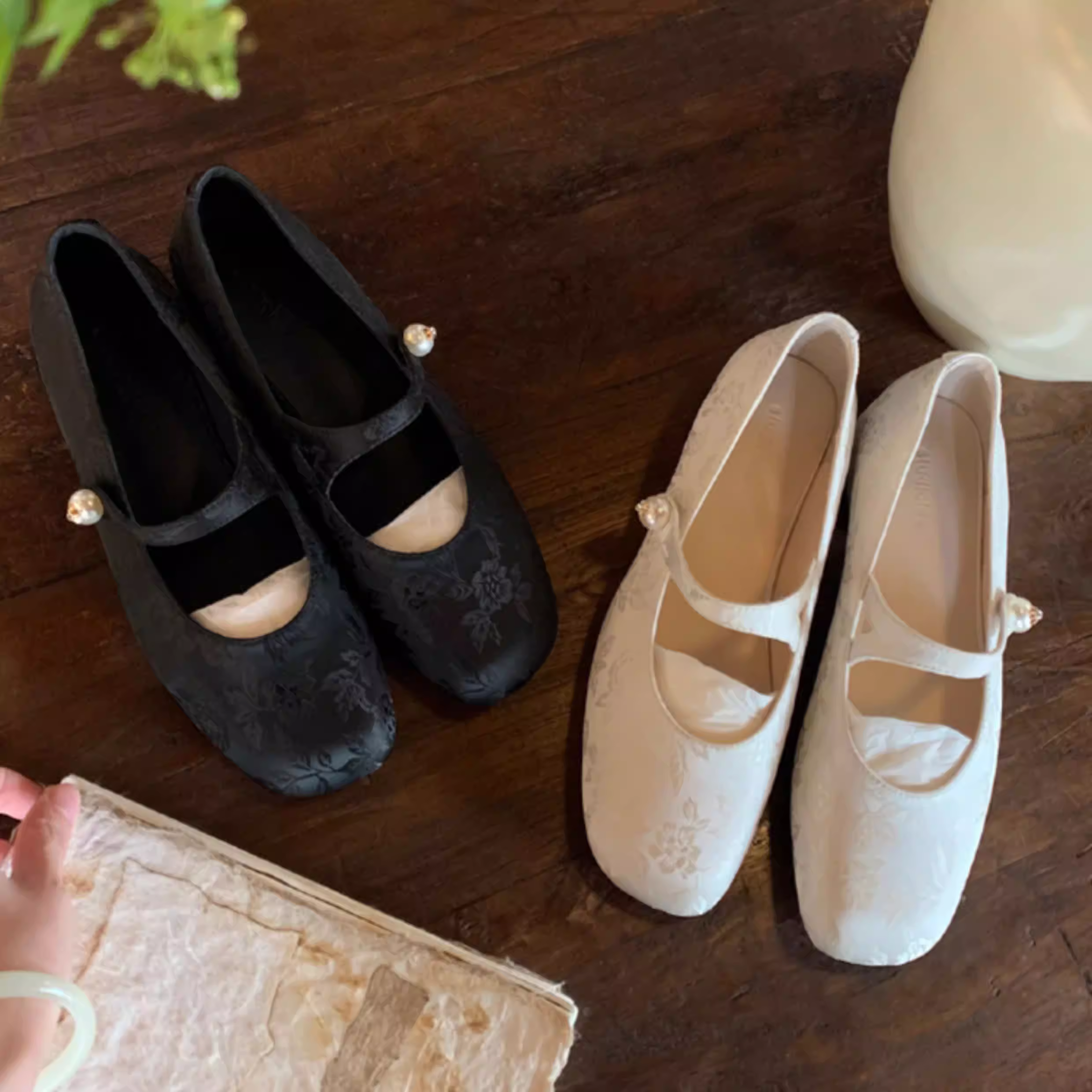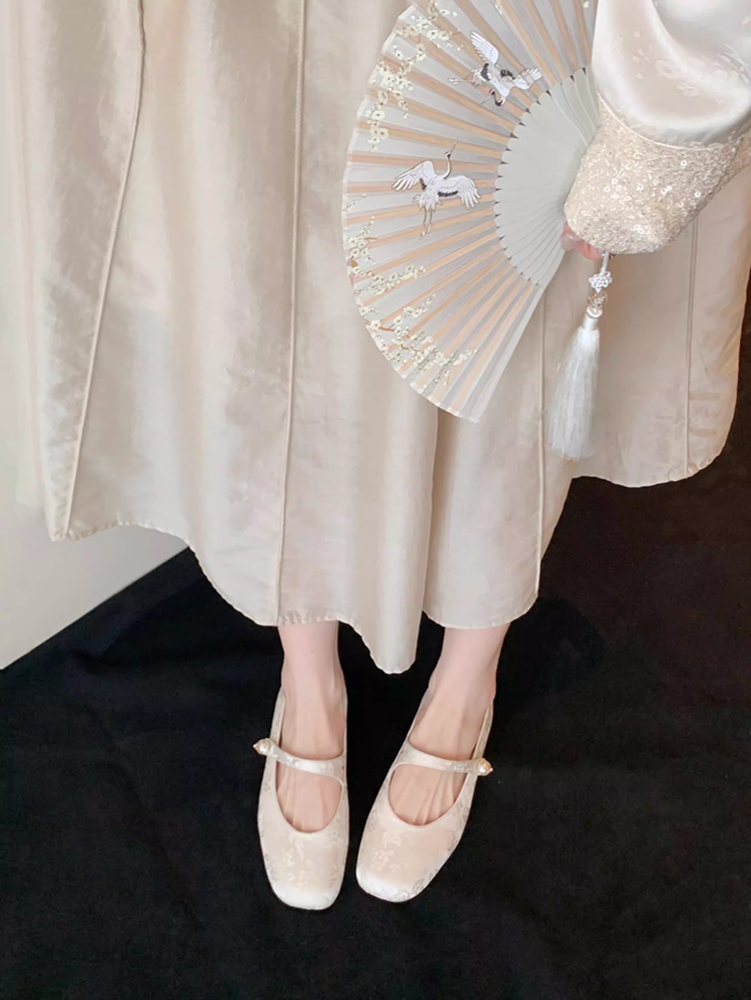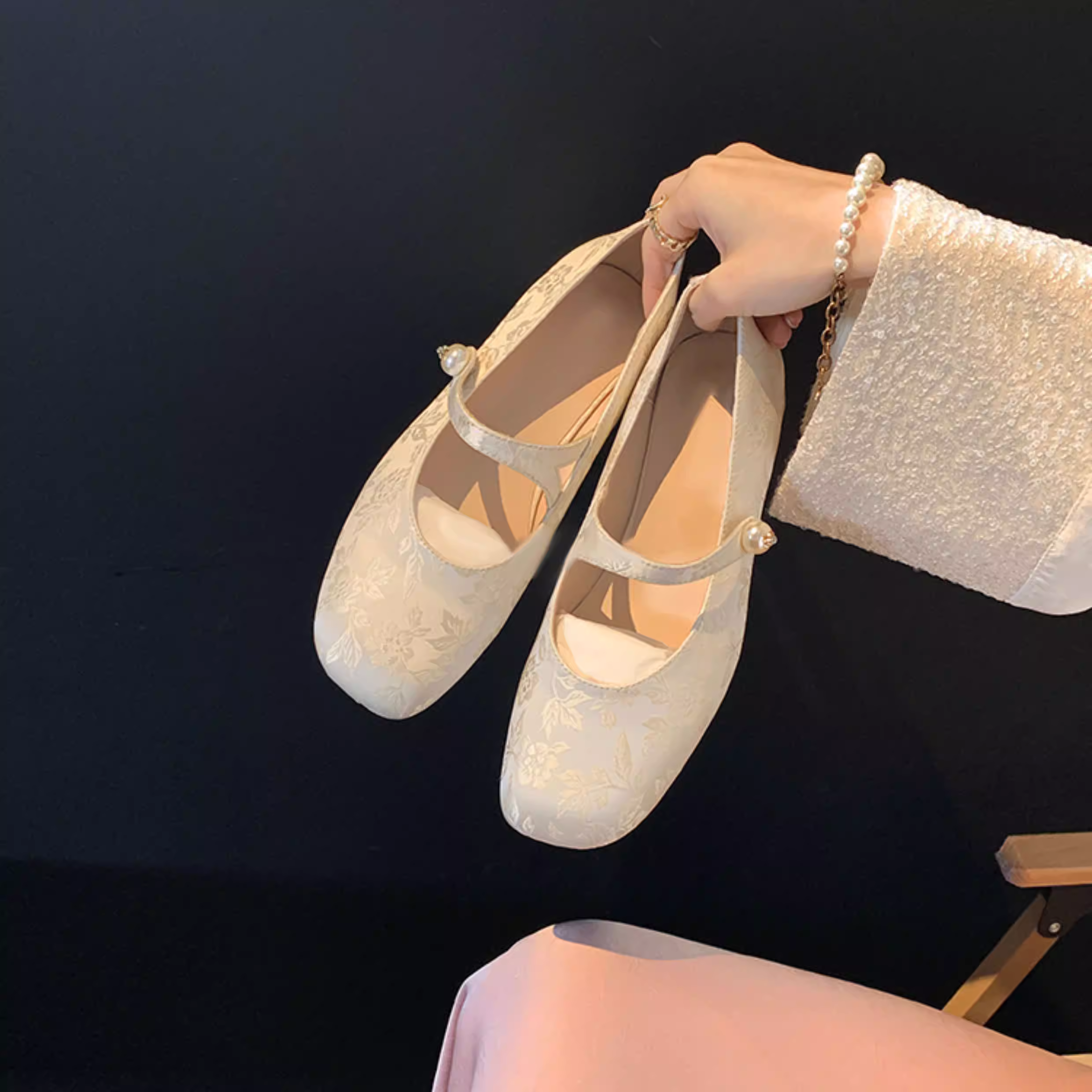 - Phiên bản da cừu~ Giày đơn nữ kiểu Trung Quốc mới, phối cùng váy, chất liệu satin jacquard đính ngọc trai, quai đơn, mũi vuông kiểu Mary Jane