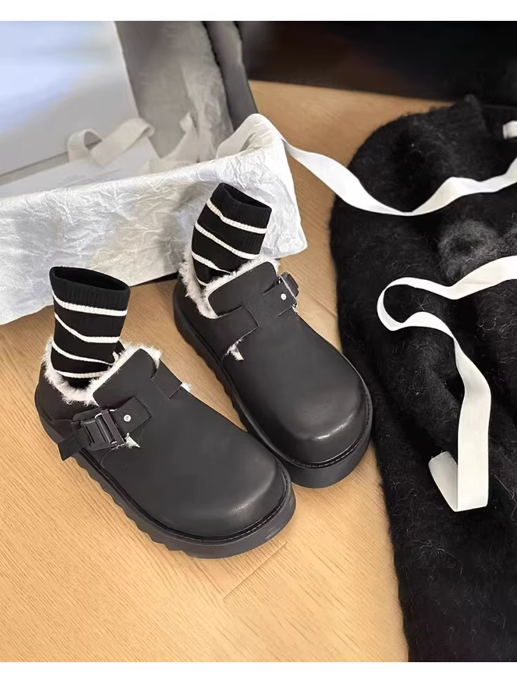 Phiên bản da cừu ~ Giày kiểu Birkenstock đế dày có khóa da lớn dành cho nữ, giày da thật kiểu retro có lót lông ấm áp, kiểu dáng cổ điển