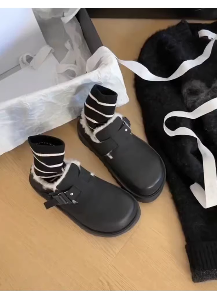 - Phiên bản da cừu ~ Giày kiểu Birkenstock đế dày có khóa da lớn dành cho nữ, giày da thật kiểu retro có lót lông ấm áp, kiểu dáng cổ điển