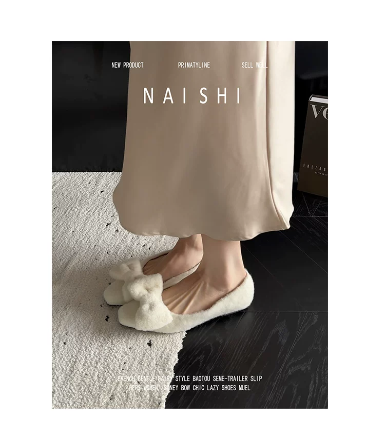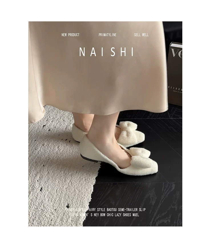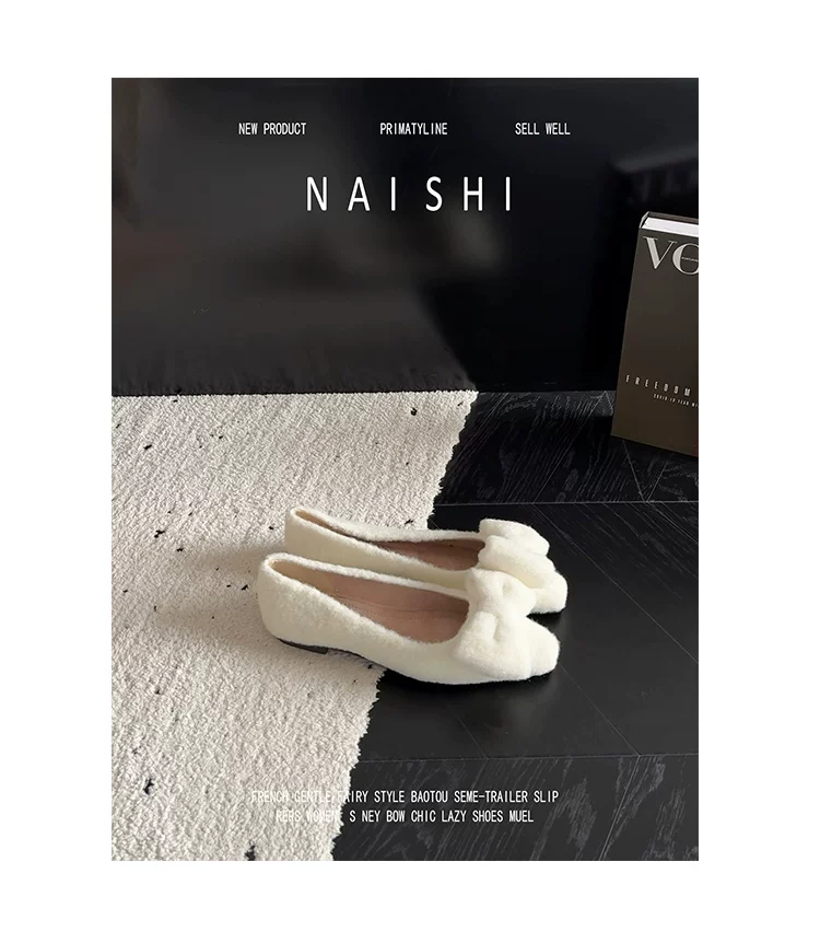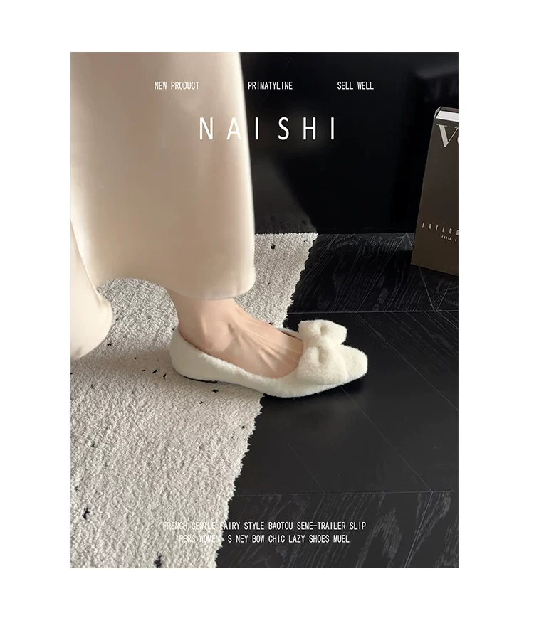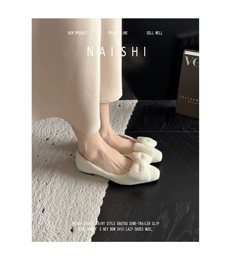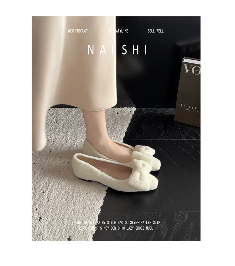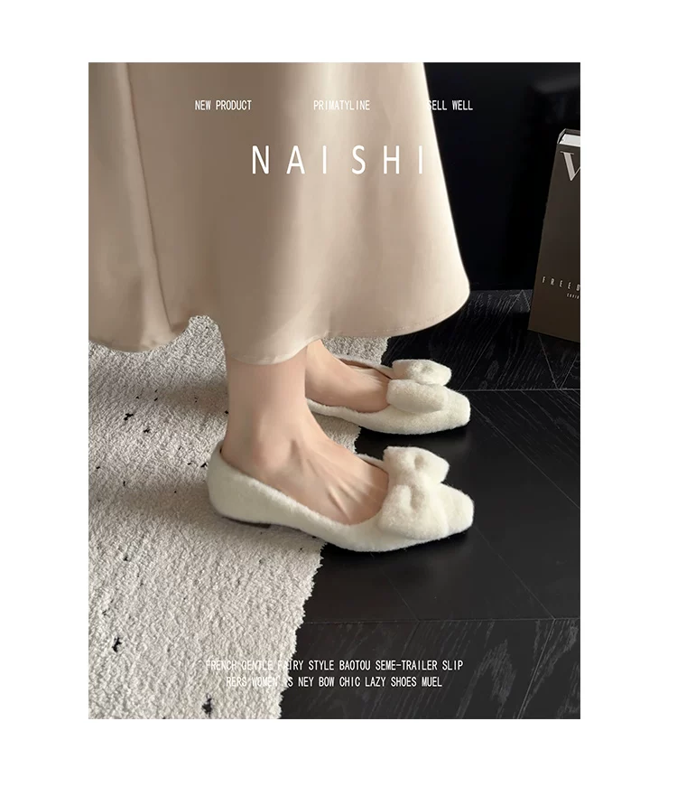 Phiên bản da cừu! Giày lông trắng có nơ nhẹ nhàng, giày đế thấp phối cùng váy, giày Mary Jane lông mềm kiểu Chanel.