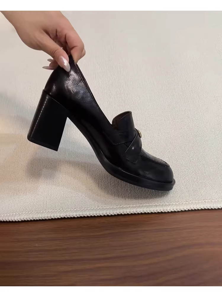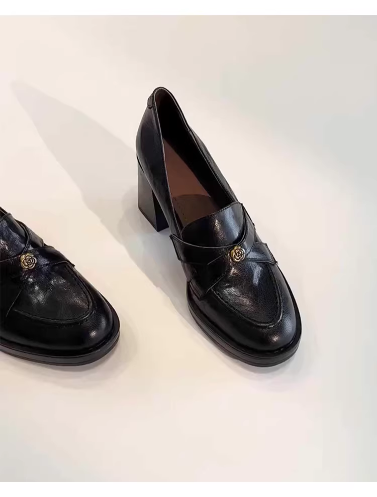 Phiên bản da cừu ~ Giày lười cao gót da thật kiểu retro camellia dành cho nữ, đa năng và sành điệu khi đi làm.