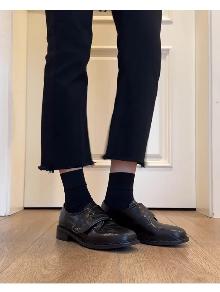- Phiên bản da cừu ~ Giày lười cổ điển có khóa dán mới dành cho nữ, giày đơn thời trang kiểu slip-on, giày da nhỏ màu đen