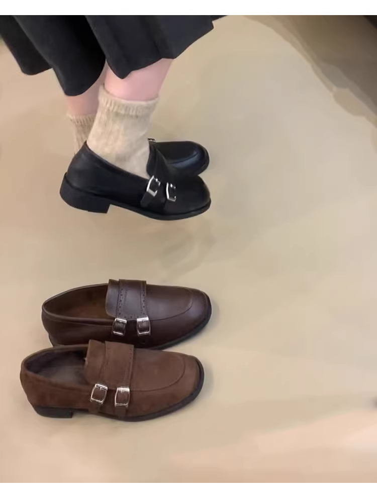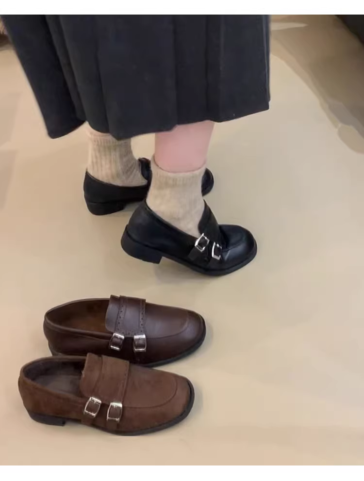 Phiên bản da cừu ~ Giày lười cổ điển có khóa đôi mũi tròn, kiểu dáng cổ điển dành cho nữ, giày đế thấp đa năng kiểu dáng preppy.