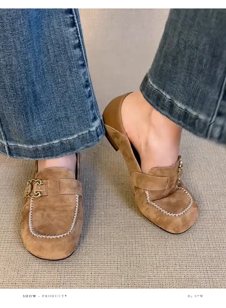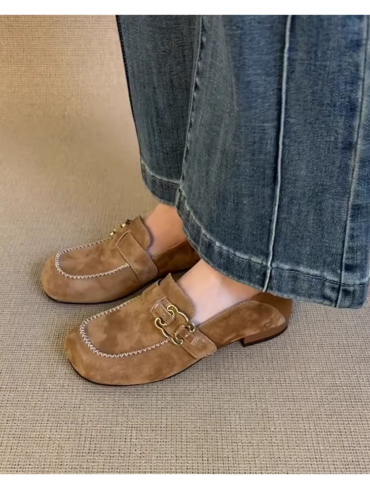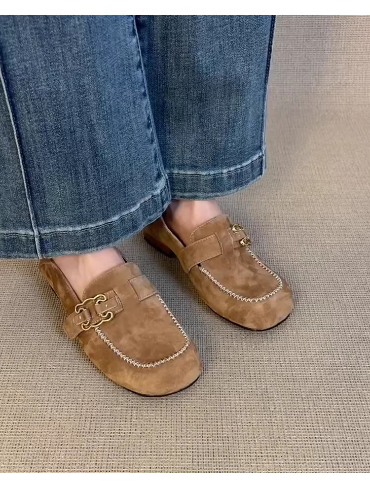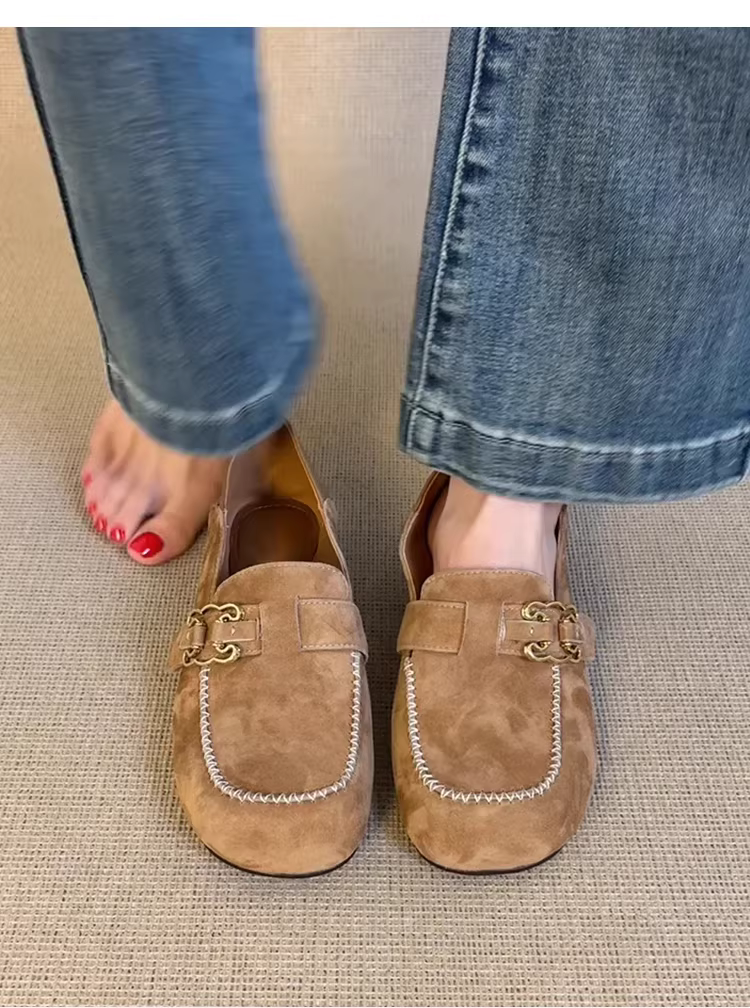 Phiên bản da cừu ~ Giày lười da lộn cao cấp dành cho nữ có khóa kim loại, giày lười dễ mang, giày đế bằng kiểu Birkenstock