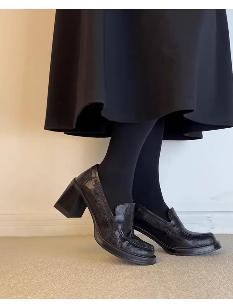 - Phiên bản da cừu ~ Giày lười da thật cao gót phong cách đại học dành cho nữ, mũi tròn kiểu Anh, giày đế thô kiểu dáng slip-on, giày da nhỏ kiểu JK