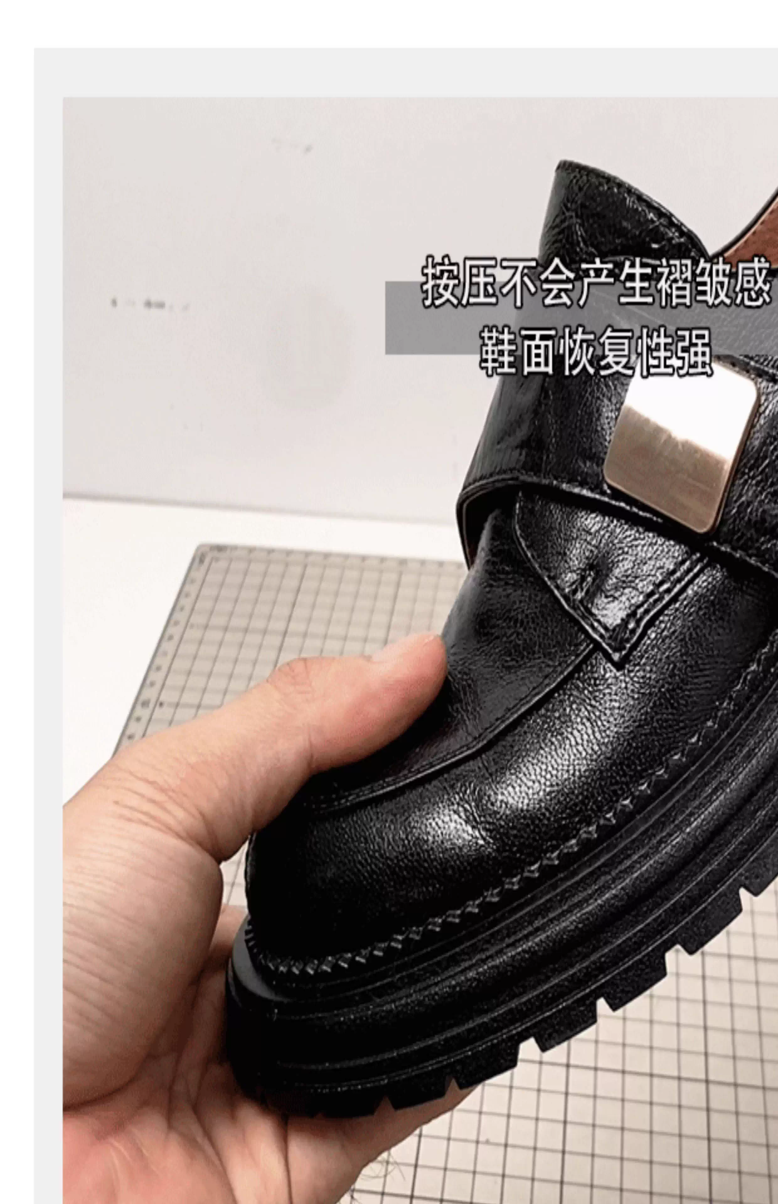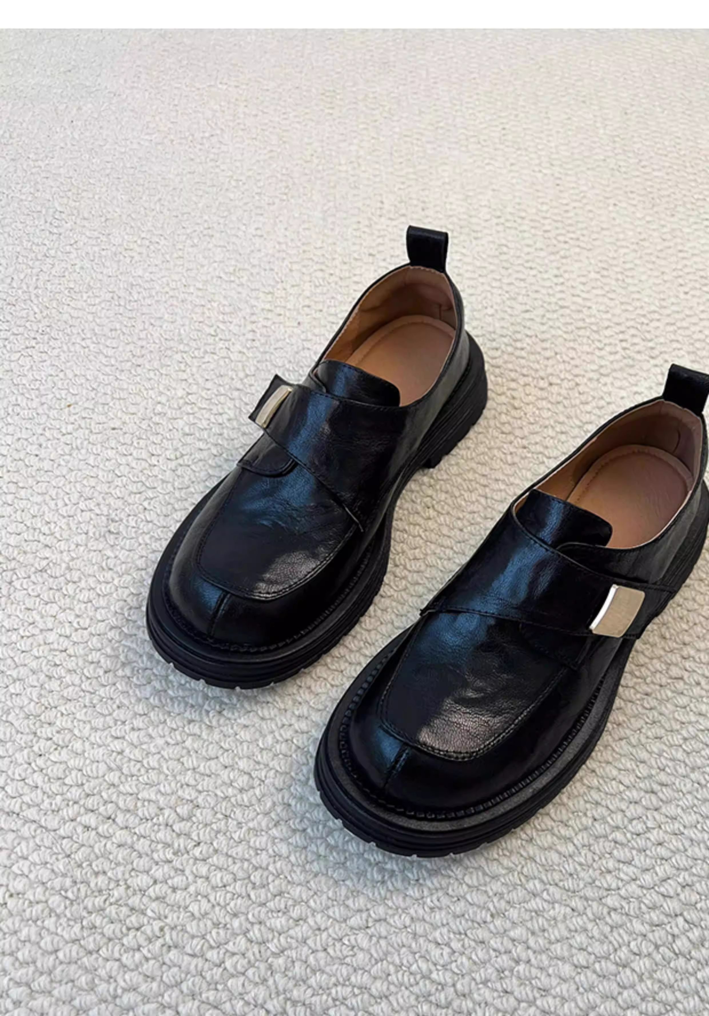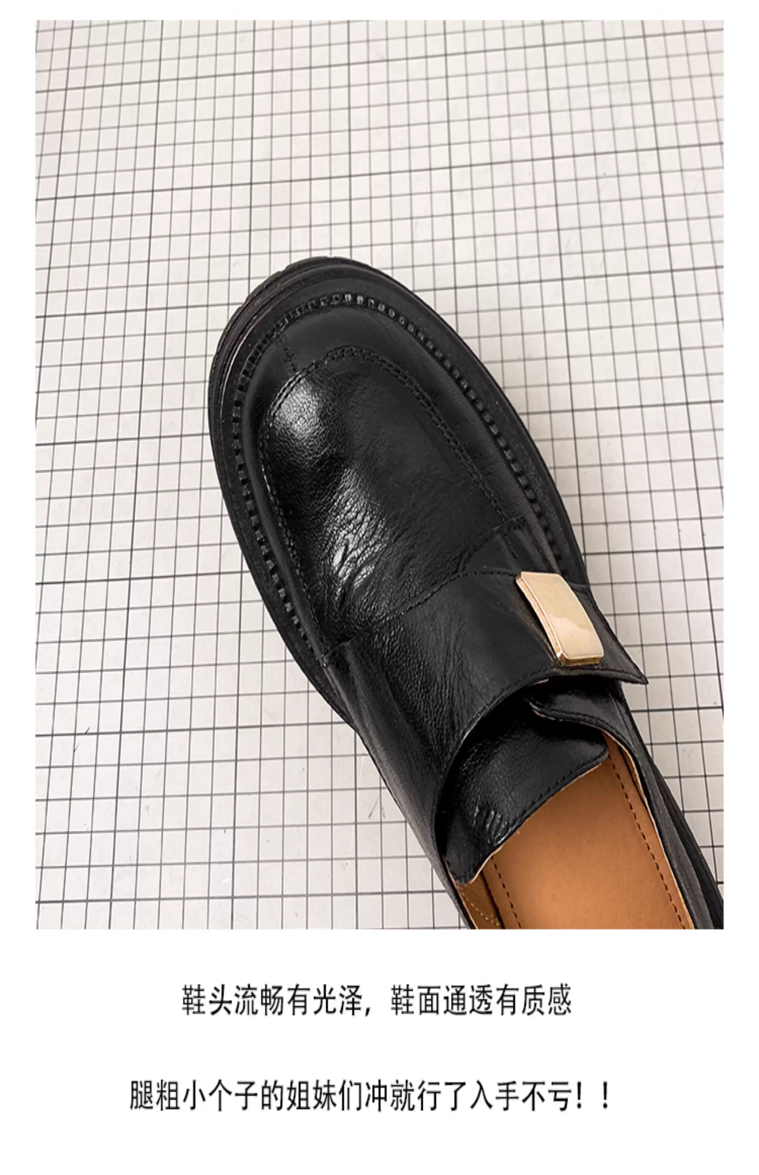 - Phiên bản da cừu ~ Giày lười da thật đế dày có khóa dán dành cho nữ, giày đơn cổ sâu gót dày kiểu Anh, giày da nhỏ màu đen JK.