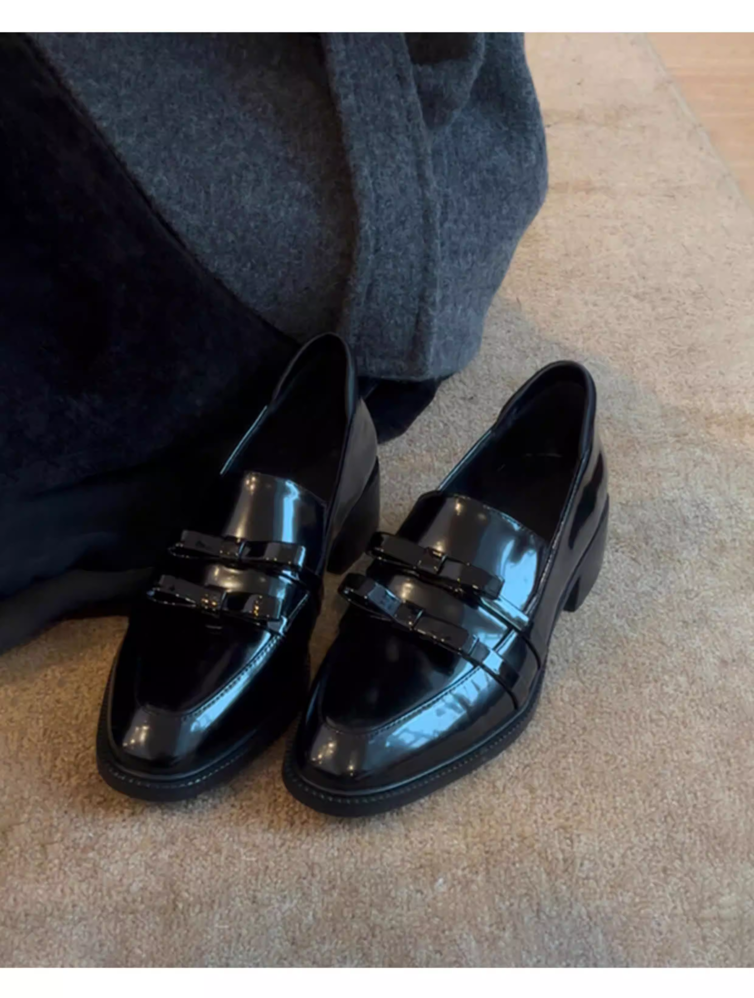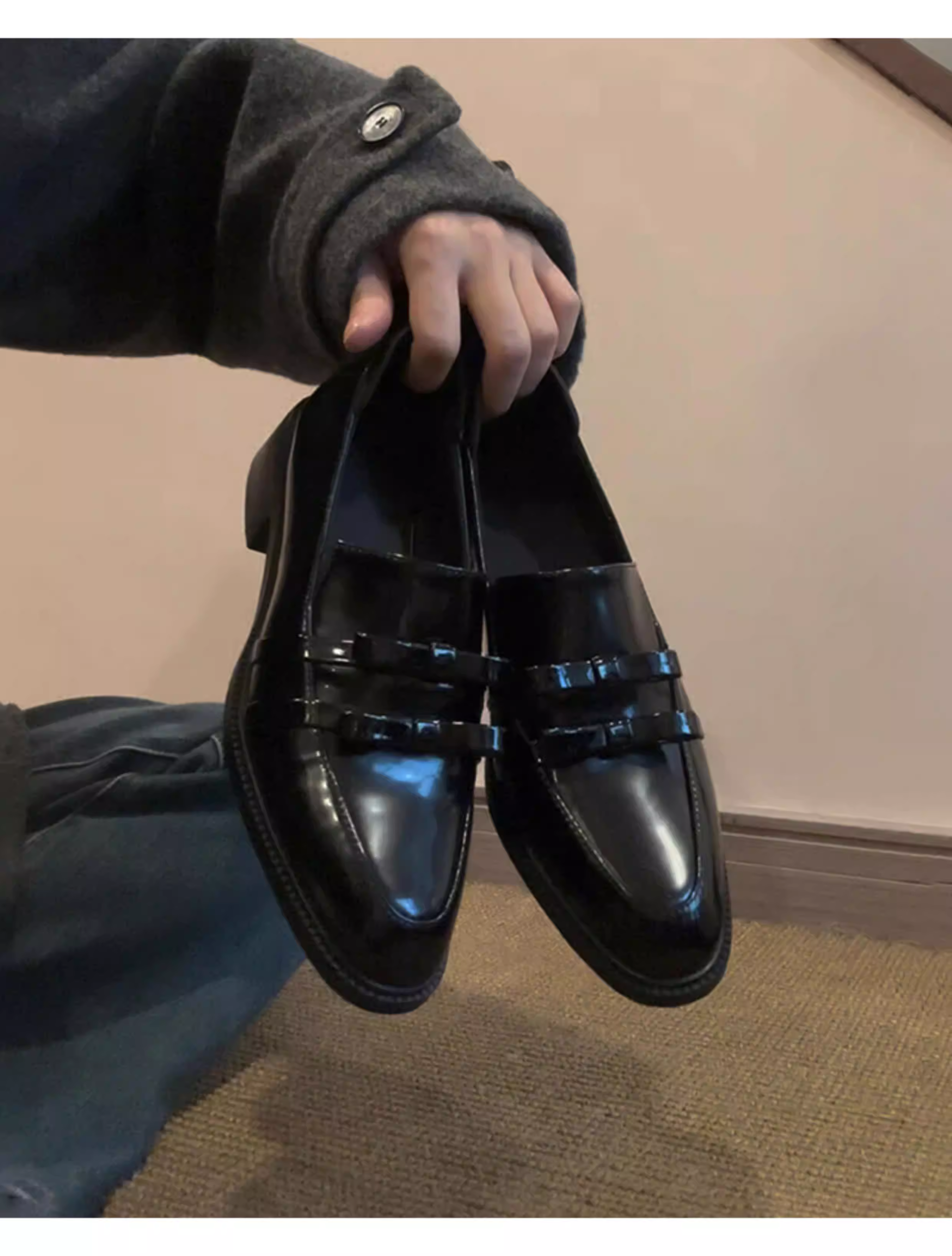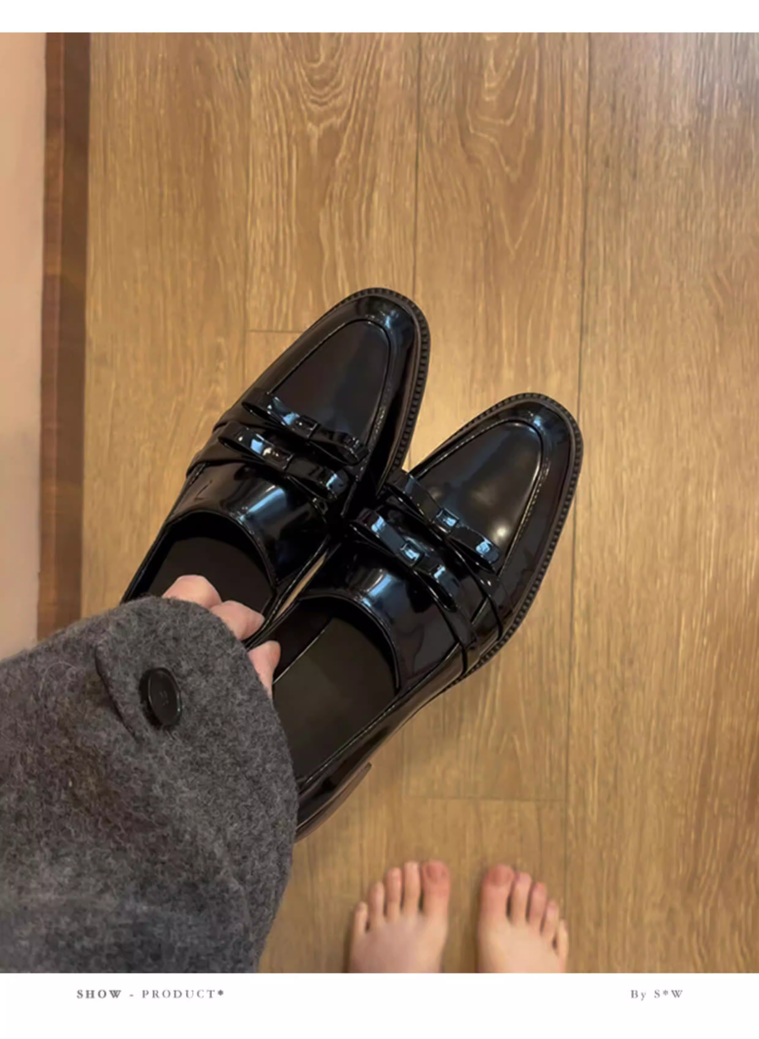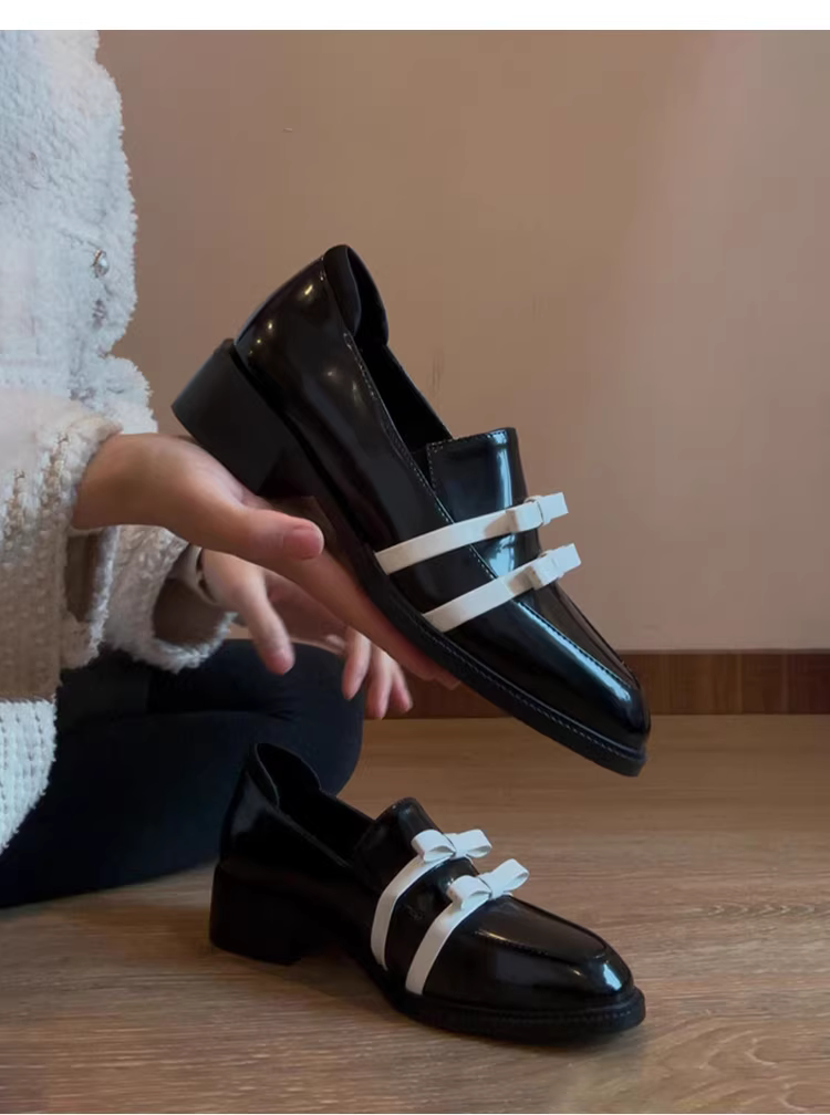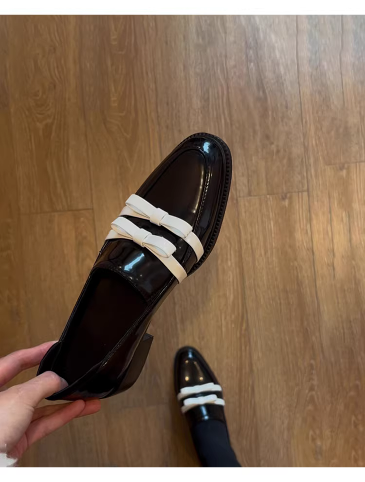 Phiên bản da cừu ~ Giày lười da thật phong cách Anh cho nữ, giày đi làm kiểu lười, giày da nhỏ có gót thô kiểu nơ kiểu Pháp