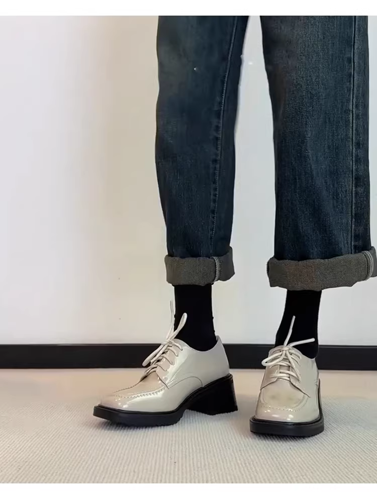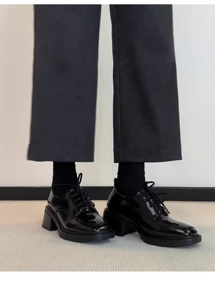 - Phiên bản da cừu ~ Giày lười đế dày mũi tròn kiểu Anh bằng da sáng chế dành cho nữ, giày da đế dày buộc dây đơn giản, kiểu dáng sâu, thích hợp đi làm