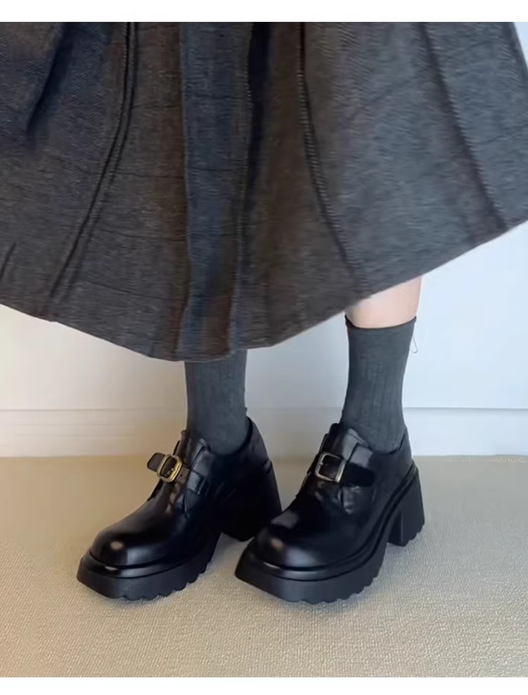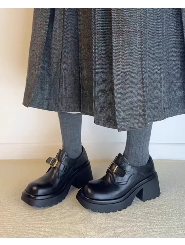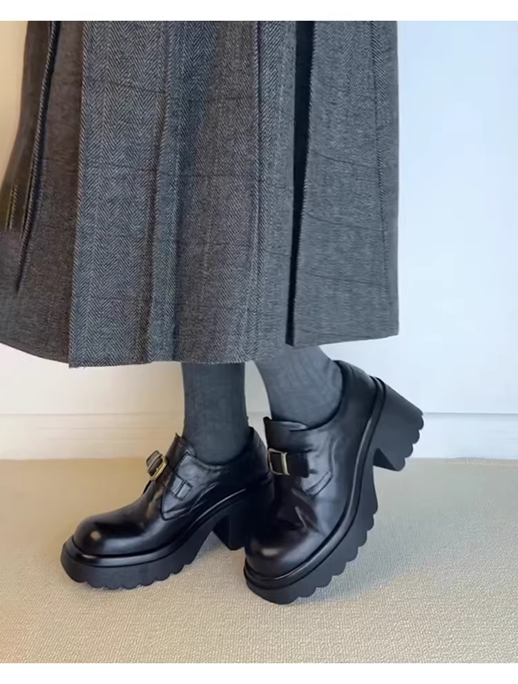 - Phiên bản da cừu ~ Giày lười đế dày tăng chiều cao bằng da thật dành cho nữ có khóa thắt lưng, giày đi làm cao gót cổ điển, giày da nhỏ.