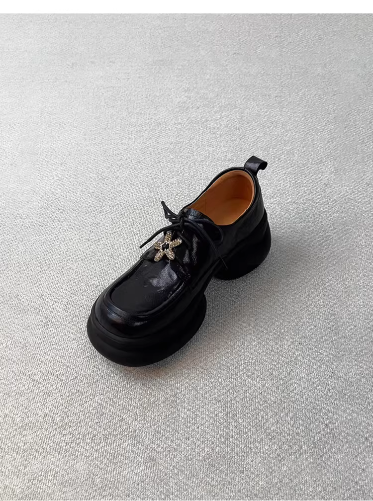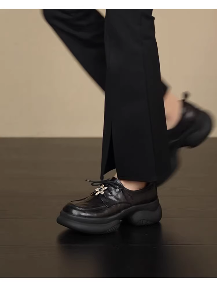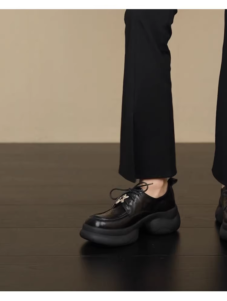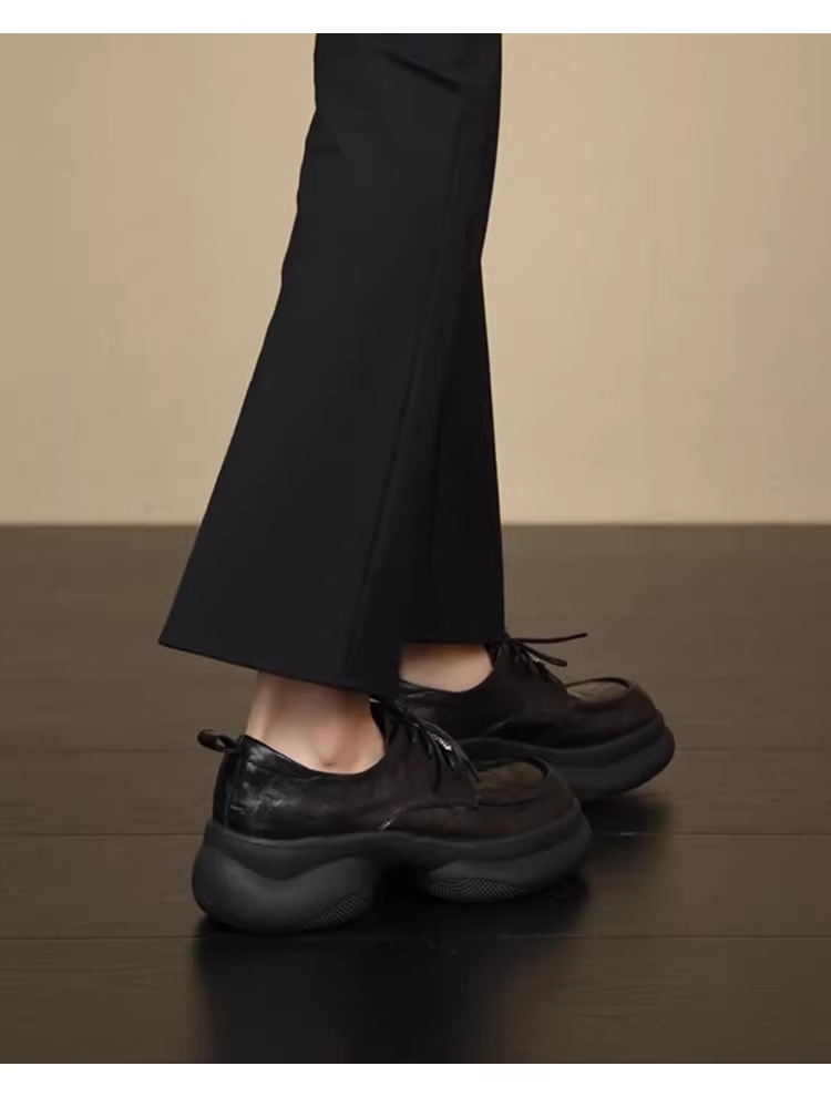 - Phiên bản da cừu ~ Giày lười đế dày tăng chiều cao đa năng kiểu cổ điển dành cho nữ, da thật, kiểu buộc dây sâu, đế platform, giày da nhỏ
