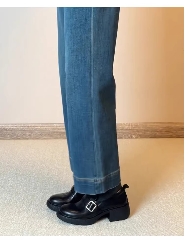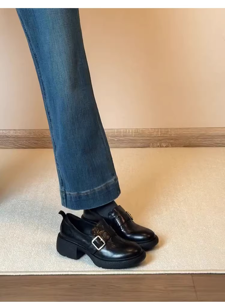 - Phiên bản da cừu ~ Giày lười màu đen đa năng, êm ái, dễ đi cho nữ, kiểu lười có khóa thắt lưng, mũi tròn, giày da nhỏ kiểu Anh